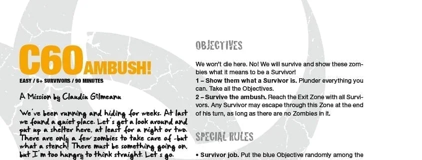 Classic MissionAmbush!Claudiu Gîlmeanu Your team has finally found a safe place to stay for a couple nights. A little cleaning will be enough to… wait, what was that noise? PDF 4 December 2015 https://cdn.svc.asmodee.net/production-zombicide/uploads/image-converter/2016/01/Mission_C60.webp 1094 845 Thorn https://cdn.svc.asmodee.net/production-zombicide/uploads/2021/11/logo-zombicide-r2.png Thorn2015-12-04 16:52:412018-05-28 09:31:37Ambush!