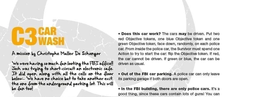 Classic MissionCar WashChristophe Müller de Schongor Looting a federal building went wrong. You have to escape but there’s no door… wait, what about creating yours? PDF 30 November 2012 https://cdn.svc.asmodee.net/production-zombicide/uploads/image-converter/2016/01/Mission_C3.webp 1094 845 Thorn https://cdn.svc.asmodee.net/production-zombicide/uploads/2021/11/logo-zombicide-r2.png Thorn2012-11-30 16:52:412018-05-28 09:32:30Car Wash