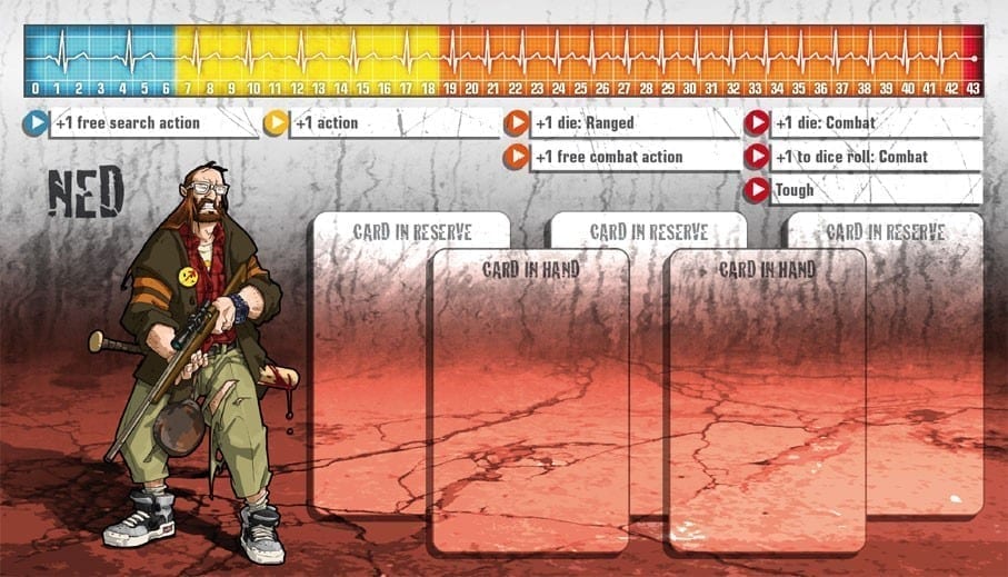 • Because he gets to search for free all the time, Ned can get good Equipment in just a few turns. He can get a ranged weapon in one hand and a melee in the other to be sure to get a firm experience progression until the Orange level, all the while upgrading his equipment! A first specialization takes place at Orange Level and is completed at Red Level. The player should make sure to pick the Skills best suited to the weapons Ned is carrying. In Ranged Combat, he’s particularly good with a rifle or sniper rifle. The fire axe and chainsaw are his favorites for Melee Combat.