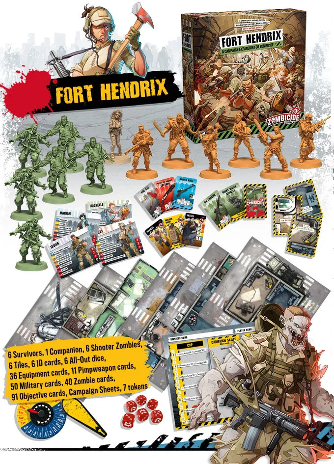 Fort Hendrix is a Zombicide experience like no other, featuring a full campaign with 6 new survivors set in a U.S. military base. With advanced rules, the story unfolds throughout 10 mission, as new challenges and opportunities arise with each choice players make. Explore the new game mechanics like survivors being able to keep their equipment from a mission to the next and watch as they unlock achievements, new powers, and reveal the next chapter of the adventure!