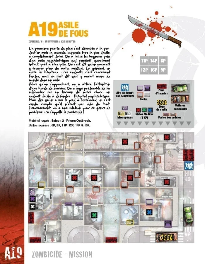 Alors qu’on s’approchait, on a attiré l’attention d’une horde de zombies. On a jugé préférable de les affronter sur un terrain de notre choix, un endroit facile à défendre : l’hôpital psychiatrique. Mais dès qu’on a mis le pied à l’intérieur, on s’est rendu compte qu’il n’était pas vide du tout. Heureusement, on a une solution pour ce genre de problème : ça s’appelle le zombicide !