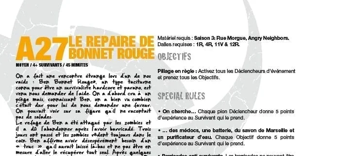 On a fait une rencontre étrange lors d’un de nos raids : Ben Bonnet Rouge, un type taciturne connu pour être un survivaliste hardcore et parano, est venu nous demander de l’aide. On a d’abord cru à un piège mais, connaissant Ben, on a bien vu combien c’était dur pour lui de nous demander une faveur. On pouvait voir sur sa figure qu’il ne racontait pas de salades.