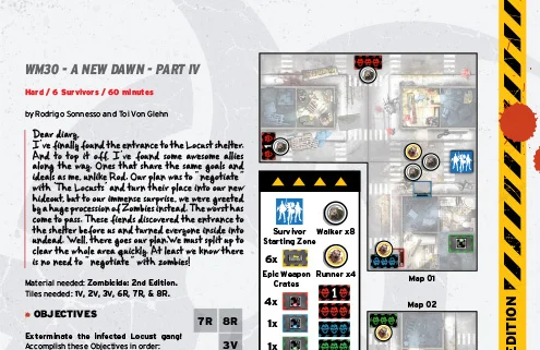 A New Dawn campaign returns for a second season! In part 4, our heroes finally found the entrance to the Locust shelter, only to discover they were not the first ones to do so (you guessed it: Zombies). This cool scenario is played on 2 separate boards!