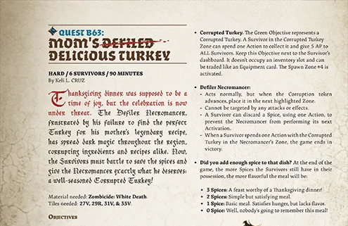 Thanksgiving turns grim as a Necromancer, unable to find the perfect turkey, spreads dark magic corrupting ingredients. Survivors must save the spices and feed him a corrupted turkey!