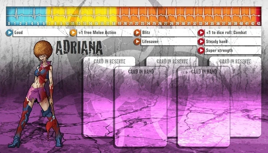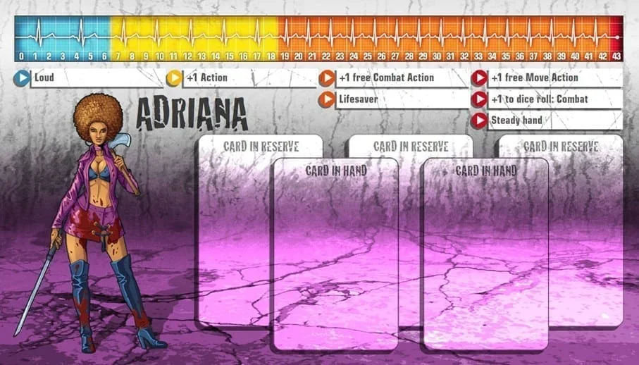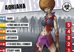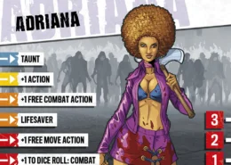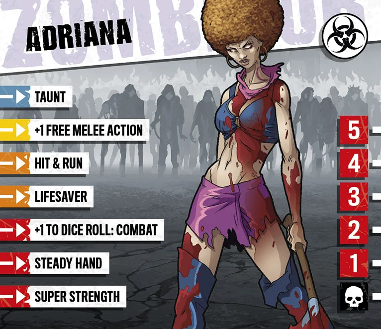 Adriana a travaillé toute sa vie juste pour avoir une chance. Dotée d’un bon potentiel mais avec peu de moyens, elle a travaillé de jour comme vendeuse et de nuit en répétition au sein d’un chœur en rêvant de gloire. Et puis les zombies sont sortis de nulle part pendant un long samedi, et ses rêves se sont brisés en quelques heures. Adriana n’est cependant pas seule. Après un furieux zombicide au centre commercial en compagnie d’une bande de survivants, Adriana a décidé d’arrêter de ne plus se battre uniquement pour elle-même, mais pour le futur. Femme enthousiaste et volontaire, Adriana est désormais l’une des plus féroces chasseuses de zombies des environs. Sa quête pour sauver le plus de survivants possibles et rebâtir la cité est une belle vision qu’elle partage volontiers.