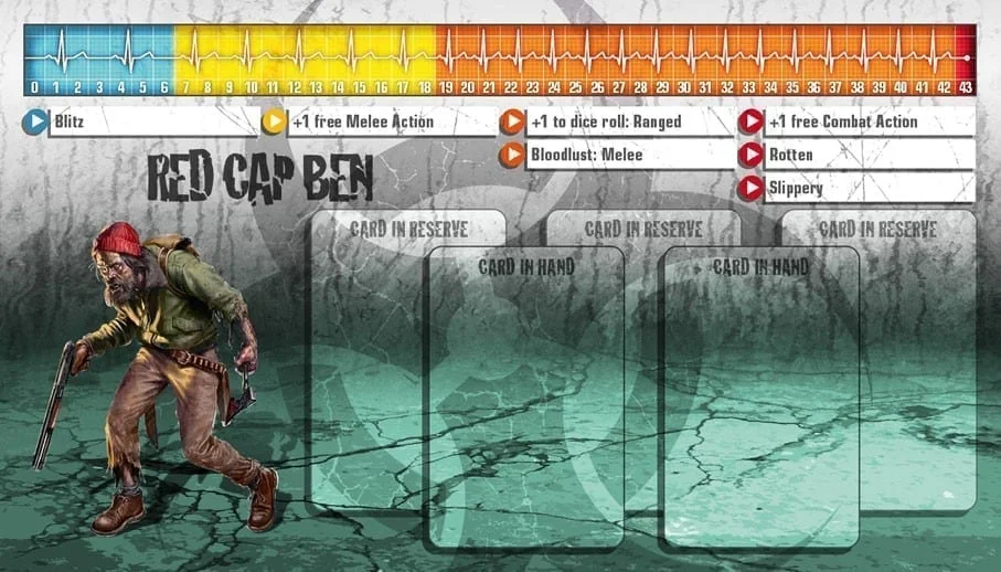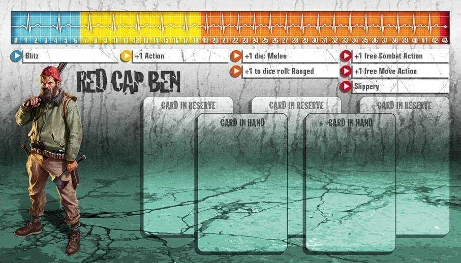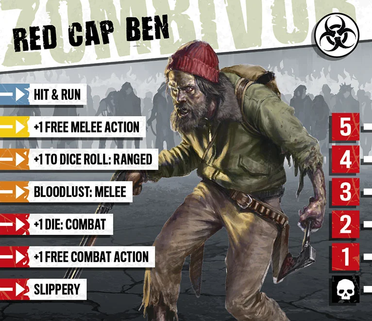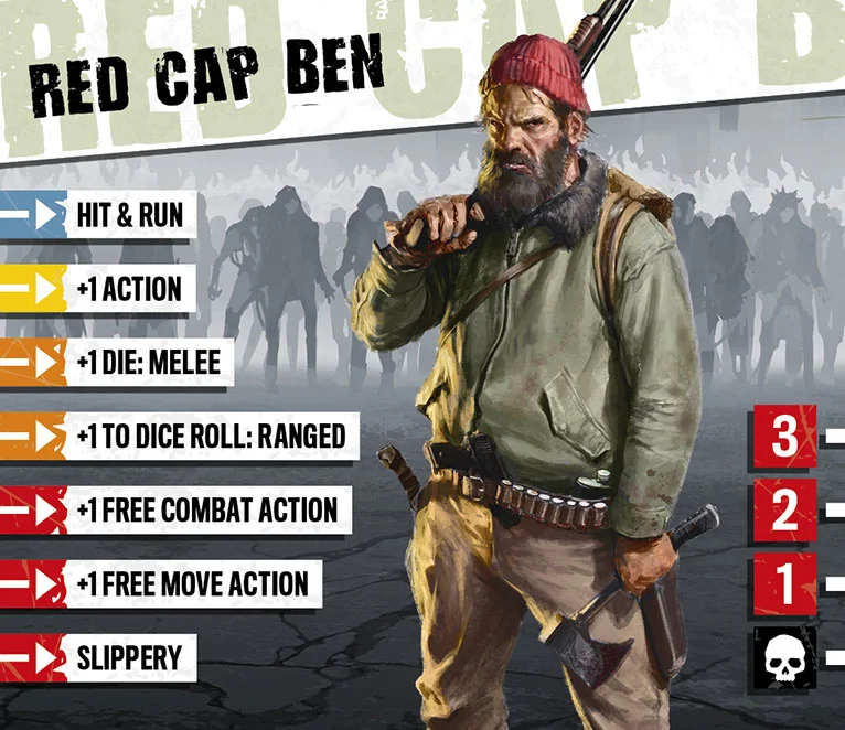 Dès son plus jeune âge, Ben fut très influencé par la Guerre Froide et la mode pour les opérations survie qui fit rage entre les années 60 et 80. Il alla de boulot en boulot, sachant que l’inévitable arriverait tôt ou tard, et prêt à tout. Il ne s’attendait pas à l’apparition des zombies, cependant, et suspecte toujours qu’il s’agit d’une conspiration gouvernementale. Aujourd’hui, Ben est plus connu sous le nom du « Bonnet Rouge », un survivaliste forcené qui collectionne les réussites sur ce qui semble être des missions sans retour. Aussi grincheux qu’il paraisse, Ben aime bien son surnom.