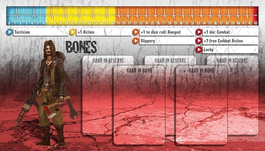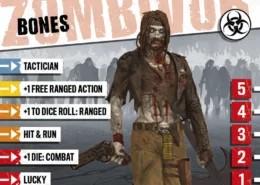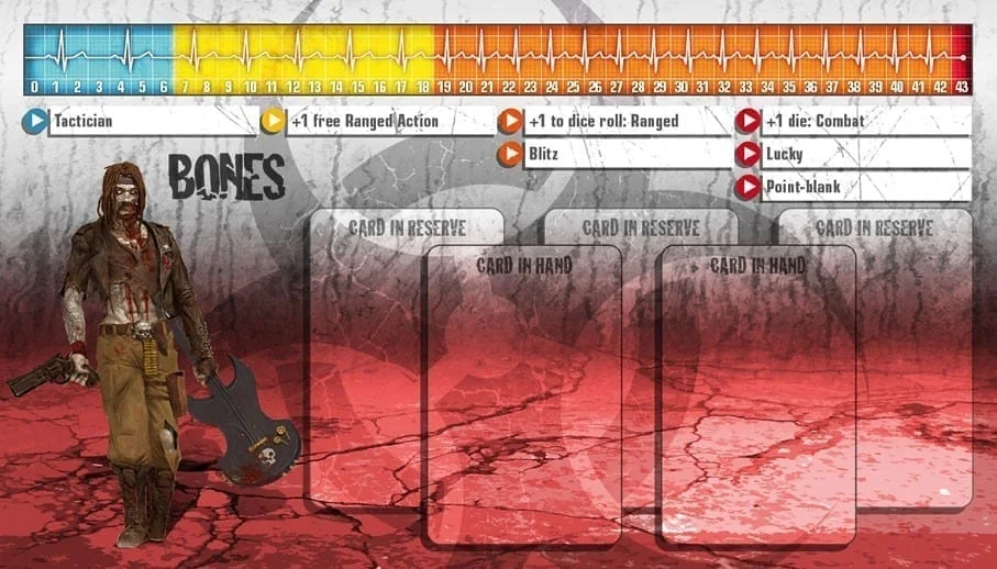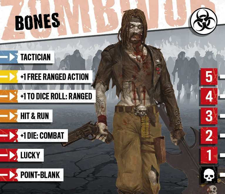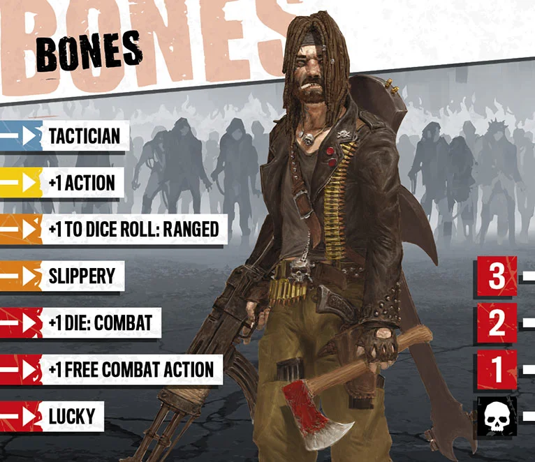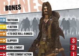 L’apocalypse zombie a tout changé, bien sûr. L’ironie veut que Bones soit désormais incroyablement inspiré pour créer des chansons sur la mort, le sang et la liberté ! Malheureusement, l’électricité est plutôt rare désormais, aussi pour le moment perfectionne-t-il son « métal acoustique ».