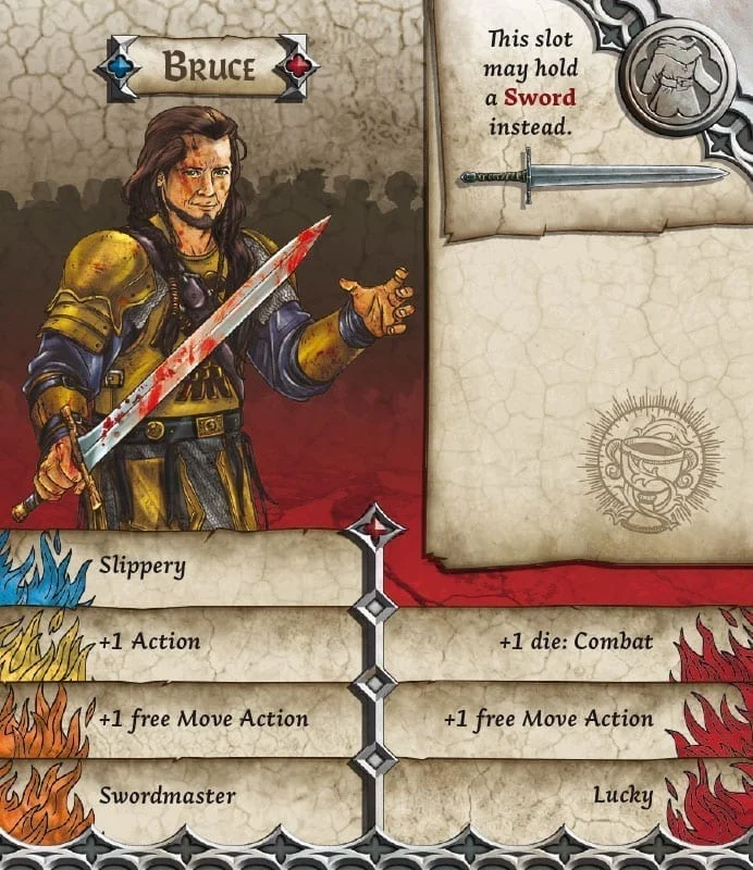 Bruce fera tout pour de l’argent, n’importe quoi, c’est ainsi qu’il s’est retrouvé dans cette situation. Il n’est pas très regardant sur les contrats qu’il prend, et pas du tout discriminant, mais il n’a aucun problème à abandonner son travail s’il se révèle désagréable ou tout simplement pas assez amusant ! Comme, disons, juste pour l’exemple, travailler pour un nécromancien qui s’avèrerait être en train de lâcher une horde de zombies sur le pays… Bruce a fuit ce boulot avec rien d’autre sur le dos que son armure et les habits qu’il portait. Et il voit ça comme une réussite.
