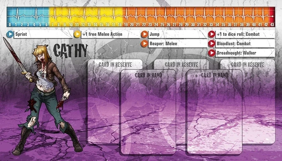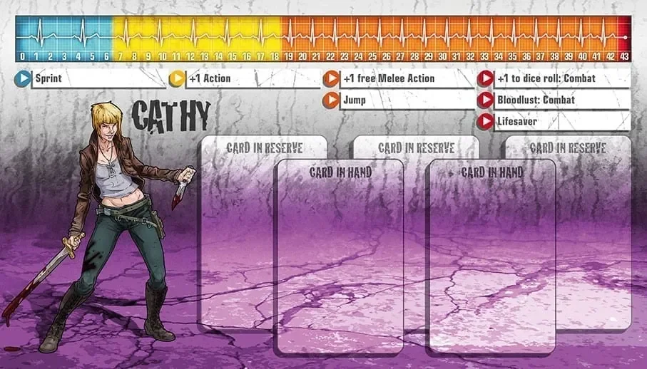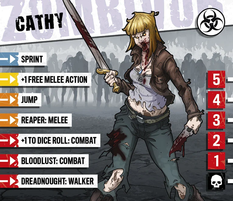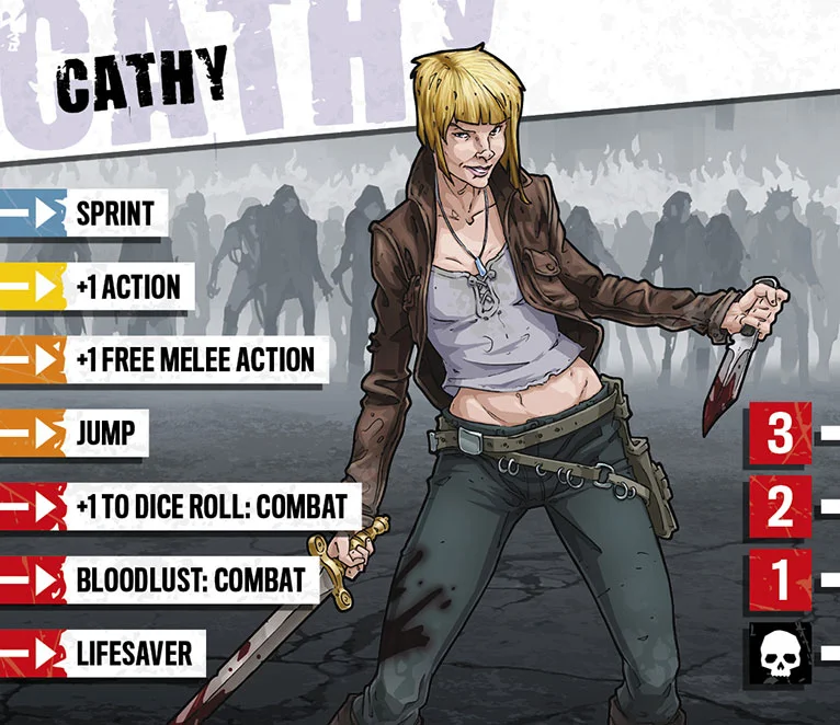 Sprinteuse au grand cœur dotée d’une haine farouche pour les zombies, Cathy peut distancer n’importe quoi ou n’importe qui (à l’exception d’une Bimbo en rollers).