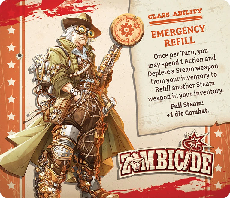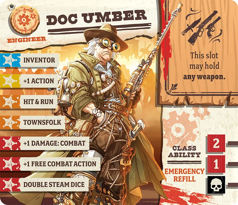 Doc Umber puts the ‘mad’ in his ‘mad engineering’. While most of his devices run off pure steam, he also dabbles with the electric fluid. Everyone knows you can generate electric power from clever use of magnets and steam power, but harnessing the ‘substance electric’ is a matter of fiction more than engineering. Yet, the good doctor insists that his weapons and gear make good use of ‘electricity’ to the tune of 1.21 watts (if such a ridiculous measurement is to be believed). As long as it kills zombies though, no one will really complain.