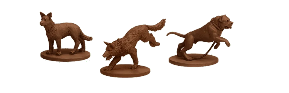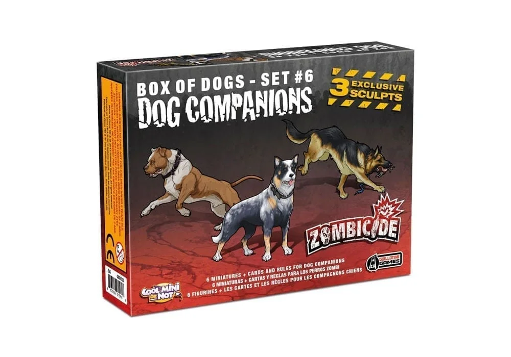 Cette boîte contient 3 Compagnons Chiens à jouer avec vos Survivants favoris et 3 cartes Equipement dévoilant trois races canines différentes. A l’heure du fléau zombie, les chiens sont plus que des animaux de compagnie, ce sont des partenaires dotés de crocs !