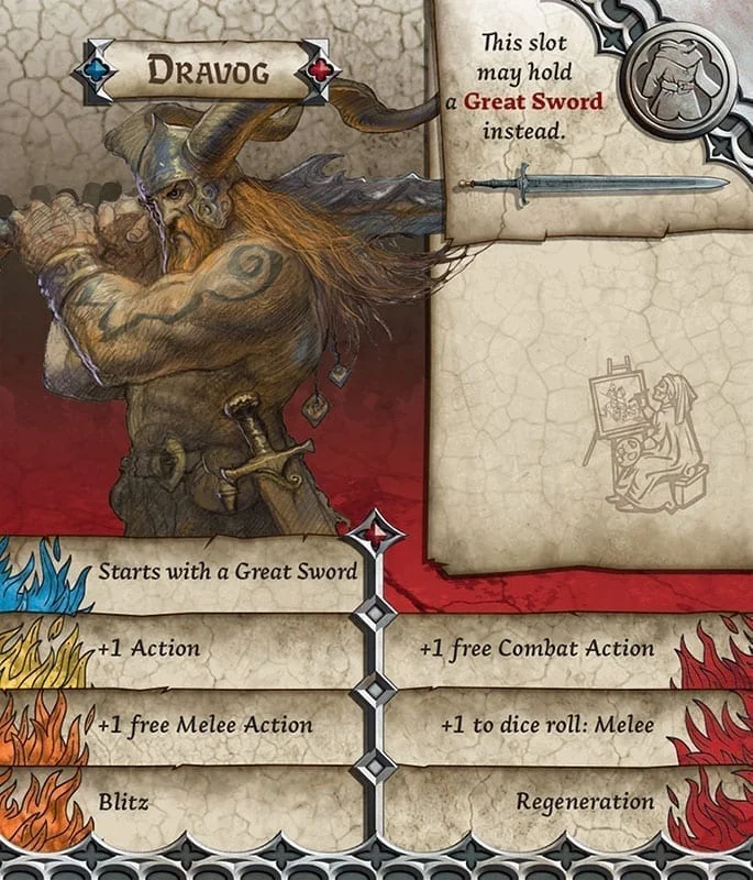 Dravog l’Equarisseur a acquis son surnom en combattant les créatures sauvages des forêts profondes. Il le mérite désormais chaque jour, alors que son épée géante abat les zombies les uns après les autres. Dravog combat pour l’honneur, pour les trophées qu’il peut prendre au combat, et pour l’amour d’une guerrière qu’il a laissé au foyer. S’il accomplit son devoir, s’il peut montrer son amour en tuant autant d’adversaires qu’elle, alors elle acceptera peut-être de l’épouser. D’ici là, il doit survivre aux hordes de zombies.