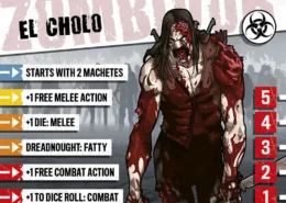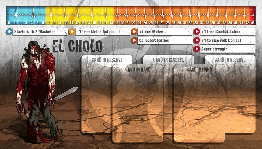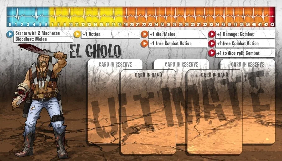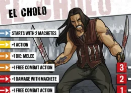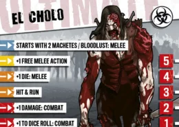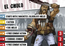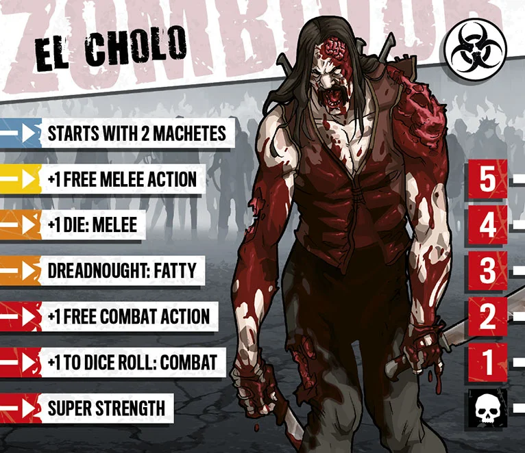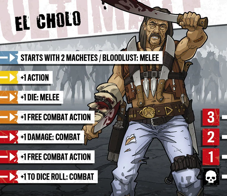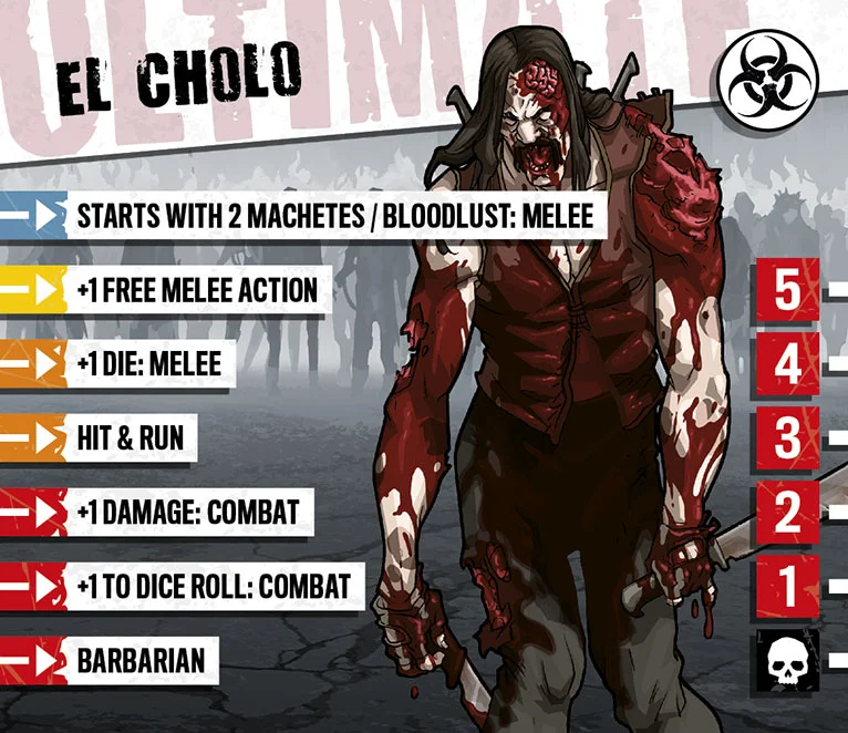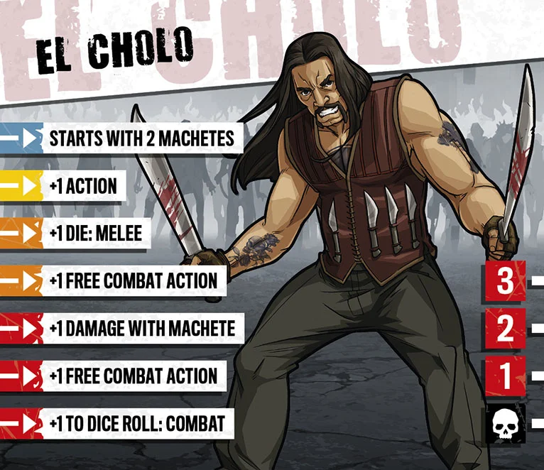 Personne ne semble connaître le vrai nom de ce latino bourru, mais tout le monde l’appelle El Cholo. On ne sait pas ce à quoi il pense, ou ce que pourrait lui être cher. El Cholo parle rarement et préfère laisser à ses machettes jumelles le soin de faire la conversation. Qu’il soit un fermier endurci ou un ancien bourreau des cartels, faucher les zombies en combat rapproché est la spécialité de El Cholo, et il est sacrément bon. Les autres survivants murmurent des histoires de combats désespérés ou de raids audacieux, et parlent d’El Cholo qui s’en sort couvert du sang de ses victimes.