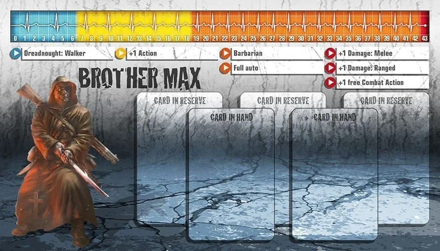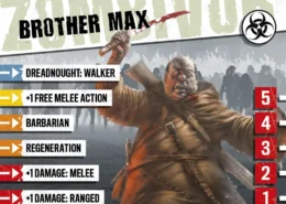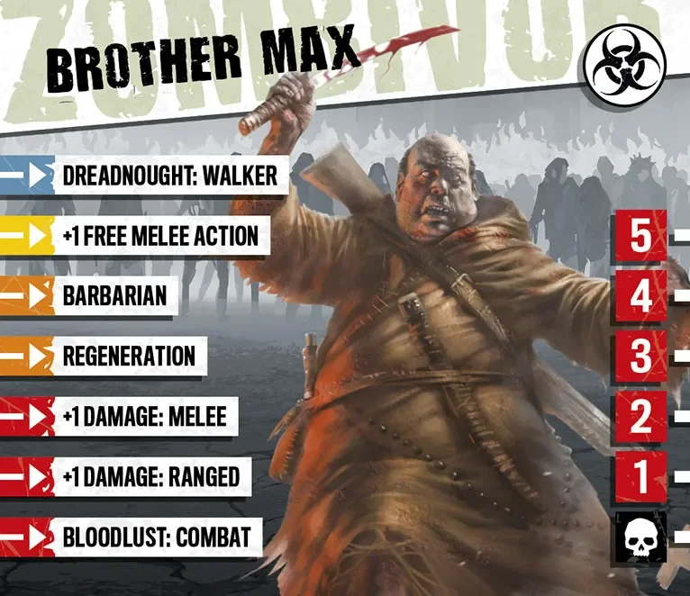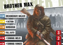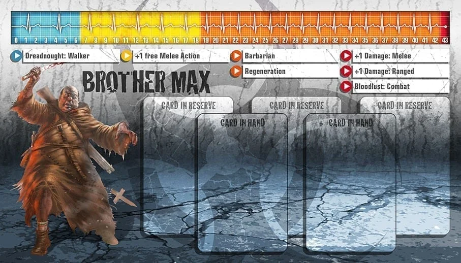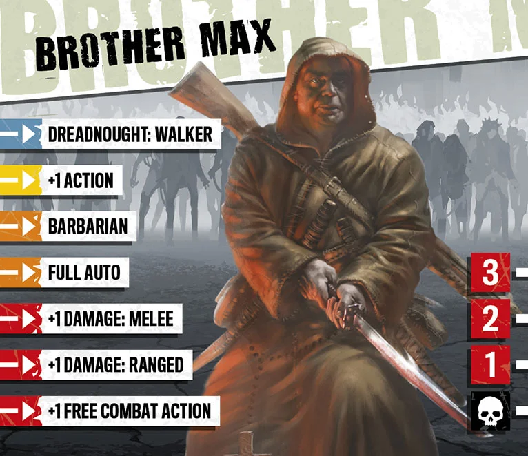 Le monastère de Frère Max fut détruit avec l’invasion de zombies et le massacre qui s’ensuivit. Dégageant des armes des décombres, il fit face au monde pour la première fois depuis des années. Frère Max envisage l’invasion comme le début de l’Apocalypse et croit que les zombies se relèvent d’entre les morts, et sont donc sacrés. En leur faisant exploser la tête, il les renvoie au Paradis auquel ils appartiennent. La ferveur religieuse de Frère Max en fait un excellent combattant, quoique le zèle qu’il met à envoyer autant de zombies que possible au Paradis puisse être énervant.