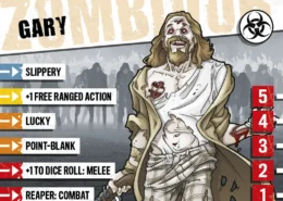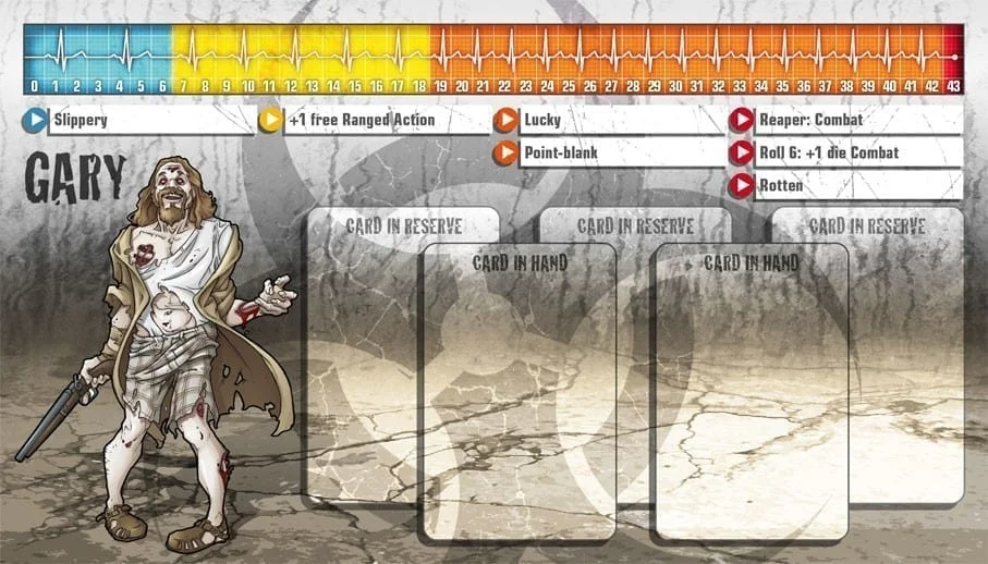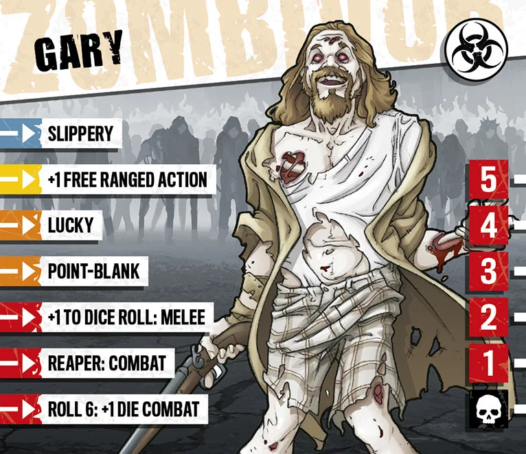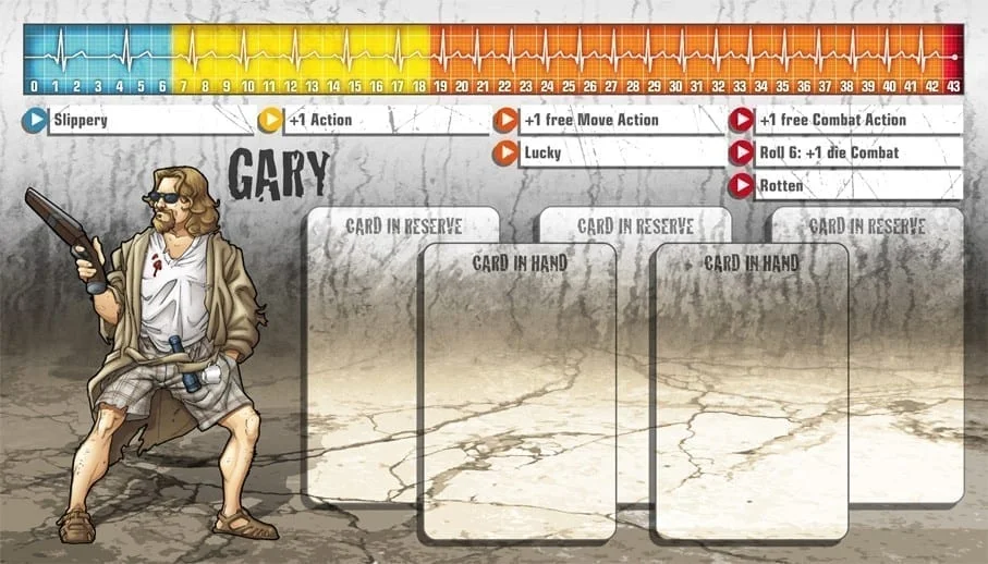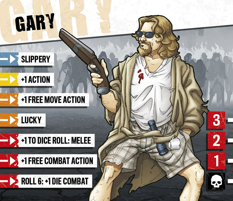“Gary le bon à rien”, comme on dit. Gary n’a pas eu une éducation de première classe et son attitude était trop “décontractée” pour trouver un vrai travail et se fondre dans la masse. Il était presque un marginal quand l’apocalypse a frappé et brisé la monotonie. Il ne faut pas se fier à son accoutrement : malgré sa nonchalance, Gary s’est très bien débrouillé tout seul jusqu’ici. Gary est un survivant depuis toujours, et les zombies n’ont rien changé à ses habitudes. Si vous êtes assez ouvert d’esprit pour démasquer Gary, il pourrait vous faire confiance et partager ses précieux petits trucs.