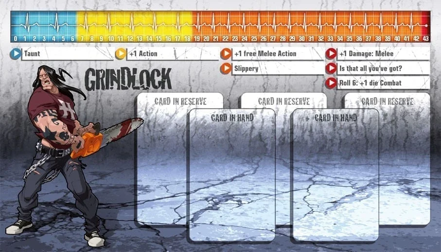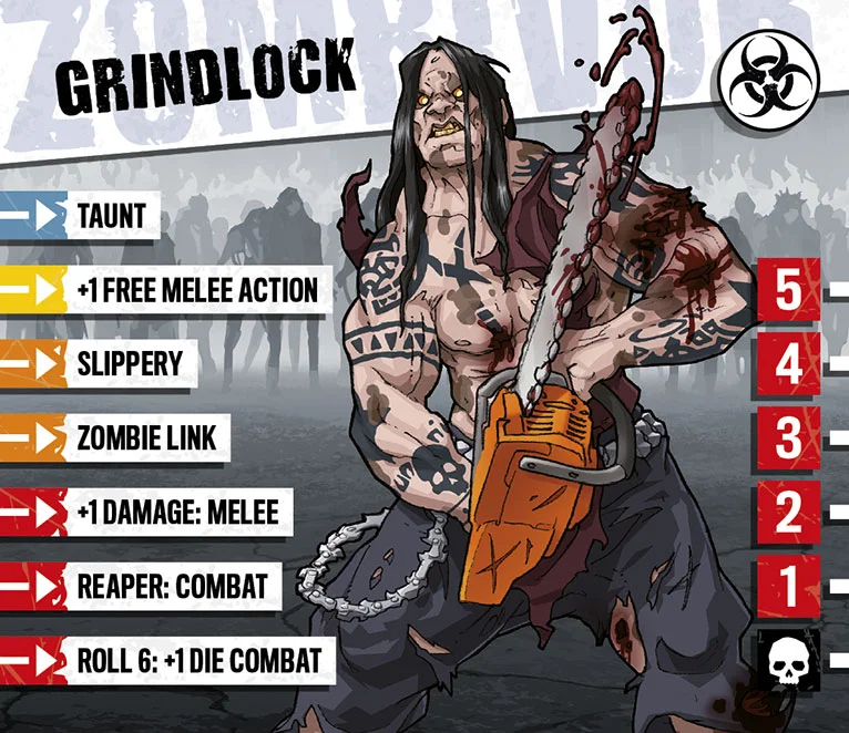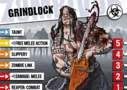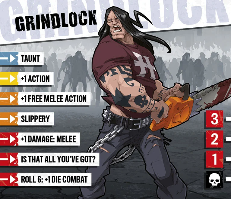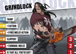Grindlock n’a pas cillé quand les zombies sont venus le chercher. Il les a slammés comme des mouches, s’est emparé d’une tronçonneuse, et s’en est allé voir l’apocalypse droit dans les yeux avec un petit sourire. Il attend désormais un adversaire assez fort pour lui faire dire que la vie est vraiment devenue métal.