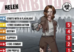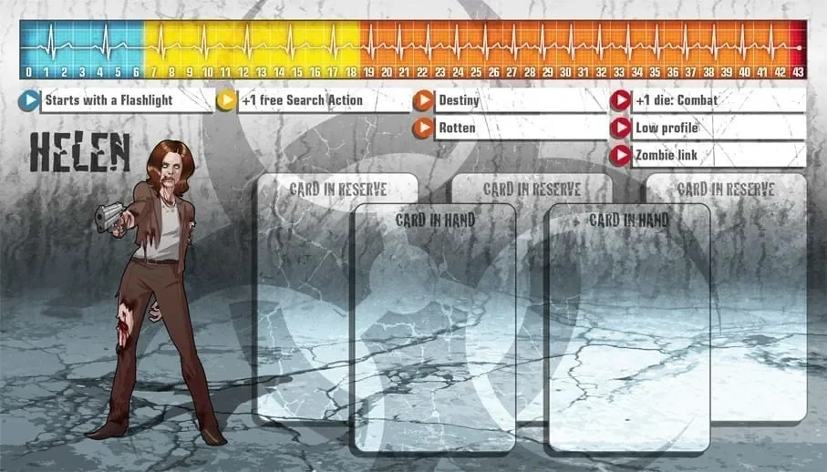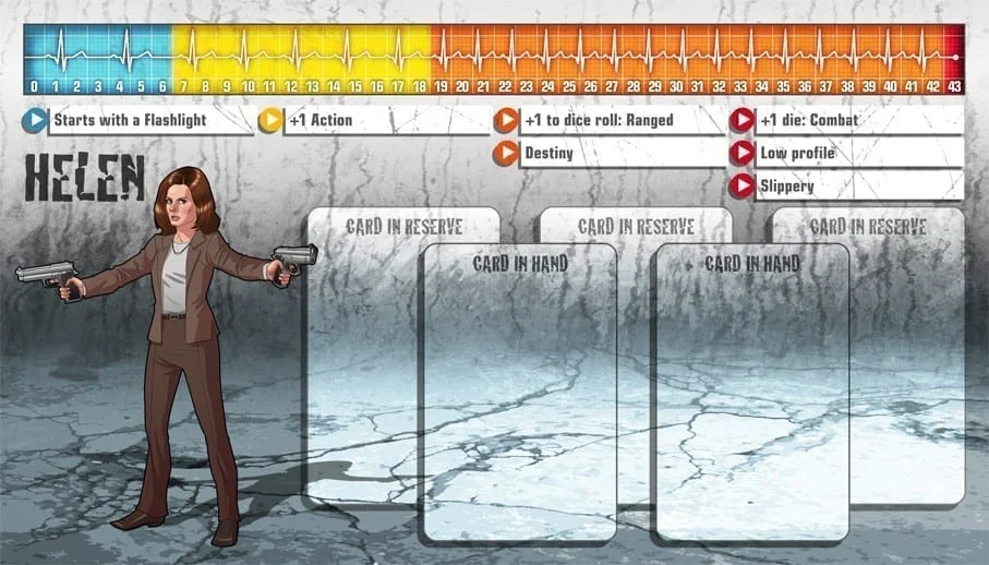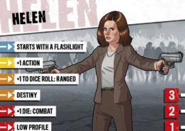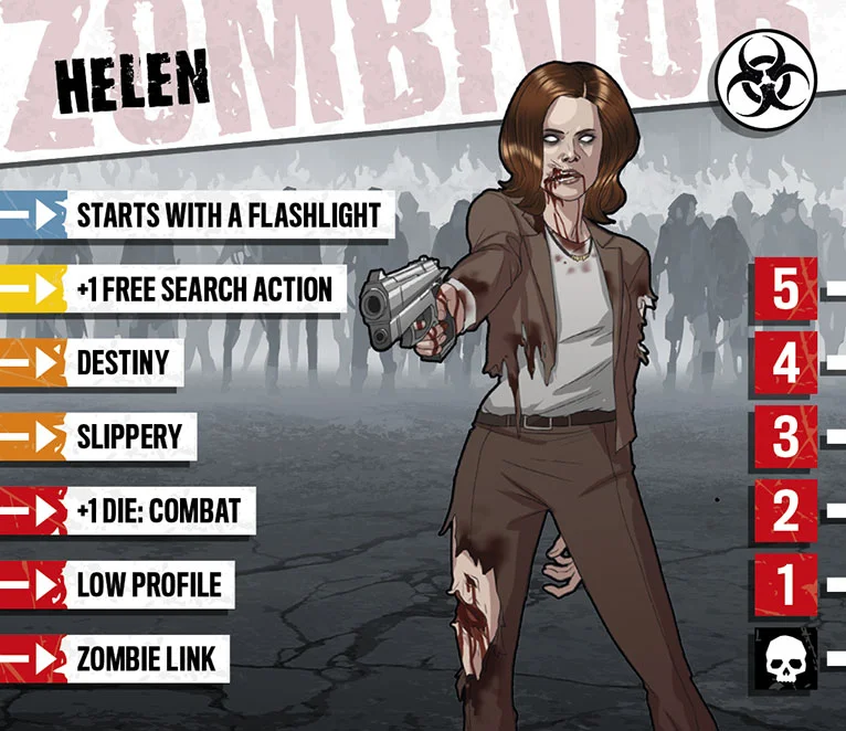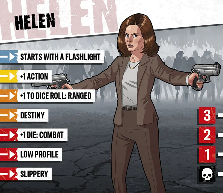 Helen était agent fédérale, fière de respecter la loi et de protéger les gens. Sa nature curieuse et son esprit logique la menèrent aux métiers de l’investigation, et elle devint une vraie terreur pour les syndicats du crime organisé. Elle parvint finalement à s’attirer le courroux des mauvaises personnes, et était suspectée de corruption quand les zombies vinrent. Le jeu n’est vraiment plus le même depuis que les rues sont envahies de monstres, mais les compétences d’Helen sont toujours remarquables. Elle apprécie notamment de ne plus avoir besoin d’un mandat pour entrer où que ce soit de force.