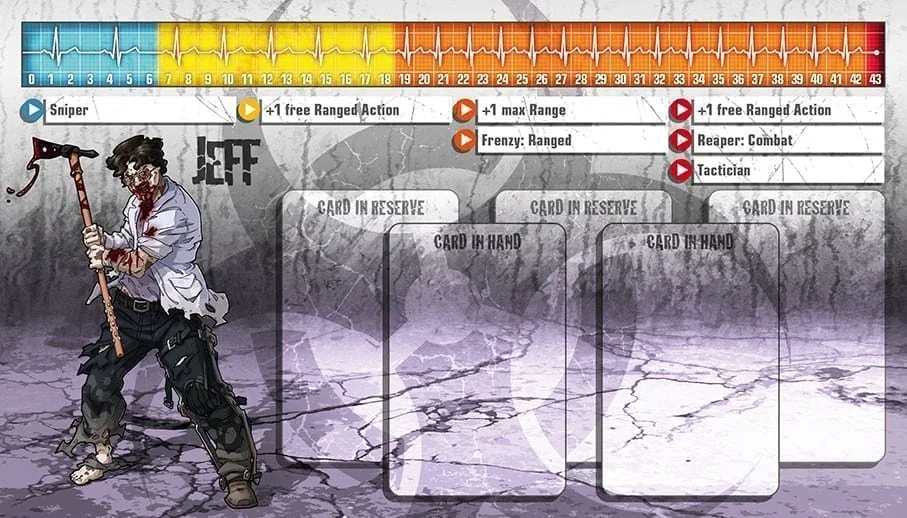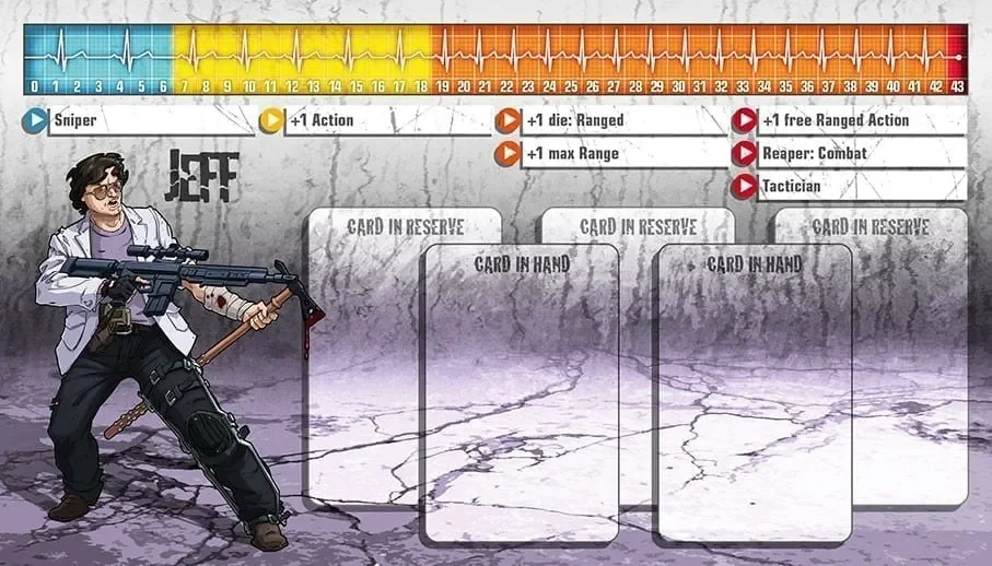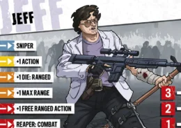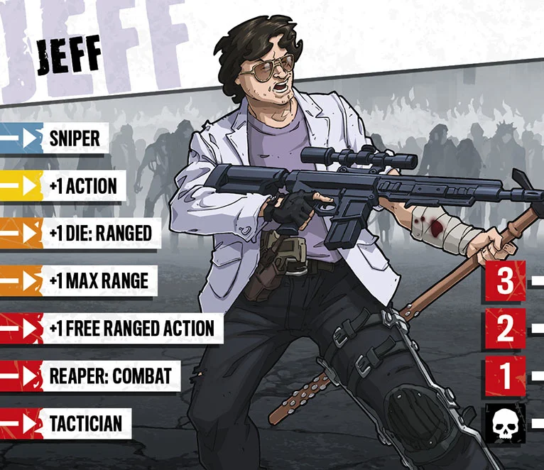 Jeff est doté d’un esprit logique et s’avère être un tireur remarquable. Il aime donner son avis sur tout ce qui se passe dans ce monde de zombies. La plupart du temps, il préconise le travail d’équipe et les frappes précises pour atteindre le but recherché. Ce n’est que lorsqu’il abat des dizaines de zombies l’un après l’autre, d’une balle dans la tête, qu’il cesse enfin de parler.