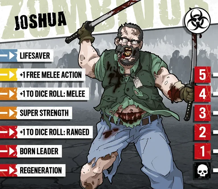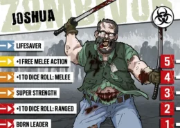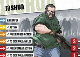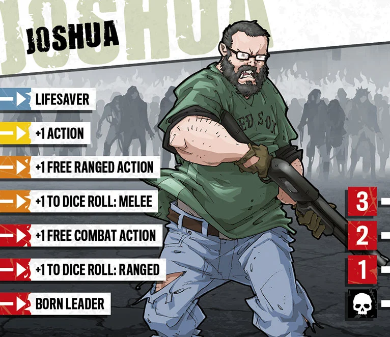 Joshua a longtemps étudié comment survivre à une invasion de zombies. Les films, les jeux vidéos et les livres disaient n’importe quoi mais contenait tout de même quelques astuces pour les esprits éclairés. Quand l’apocalypse est finalement arrivée, Joshua a fait son paquetage et a juré de sauver autant de gens que possible, à condition qu’ils l’écoutent et ne tentent rien d’idiot. Il a désormais trouvé une équipe et est prêt à tout pour la garder soudée. Joshua est toujours là pour sauver le monde !