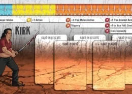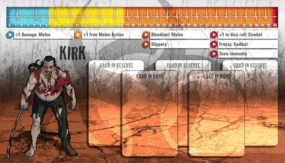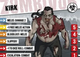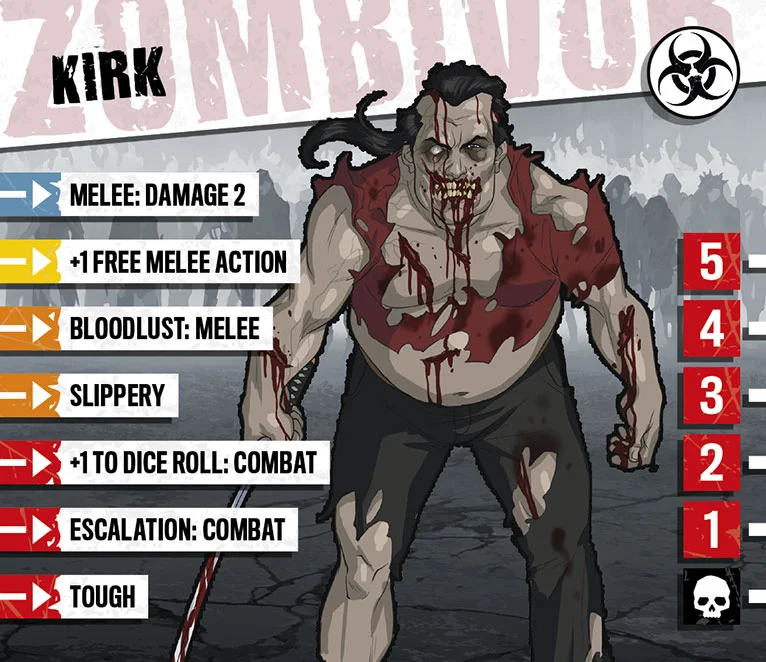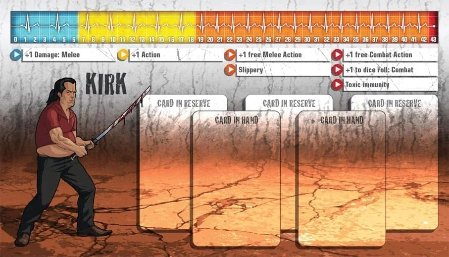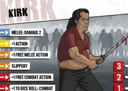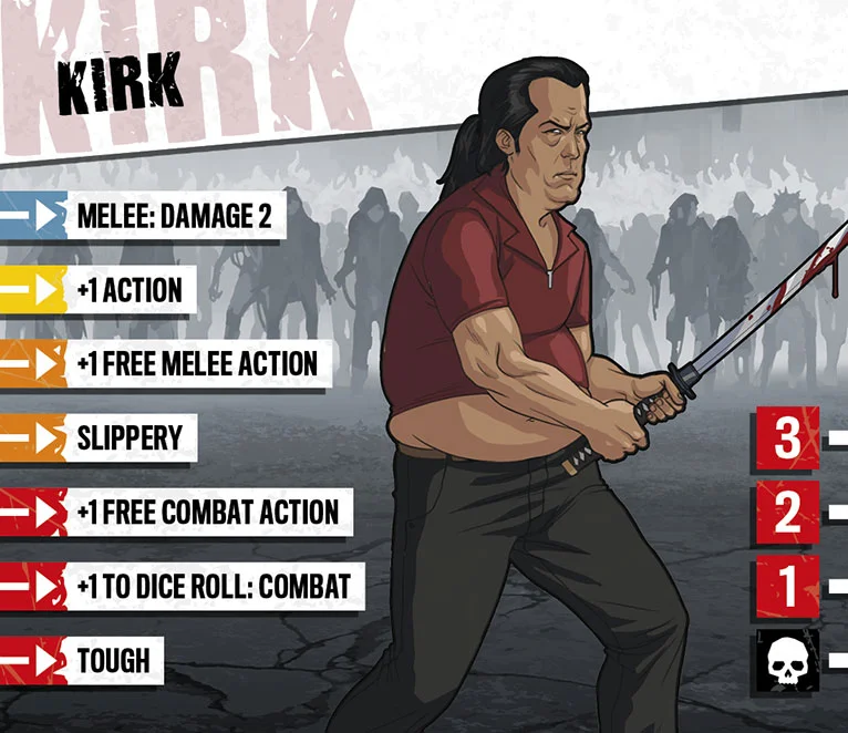 Kirk était une célébrité locale il y a vingt ans, quand c’était cool d’apprendre les arts martiaux et qu’il était le meilleur professeur du coin. Le respect s’étiola peu à peu alors que les gens trouvaient de nouvelles idoles au sein du gotha. Kirk redevint un simple quidam et perdit goût pour sa passion. La gloire et la richesse ne sont d’aucun secours face aux zombies, cependant, et Kirk s’est lui-même surpris en redécouvrant qu’il n’avait rien perdu de son habileté. Bien sûr il est désormais plus vieux, mais il retrouvera la forme bientôt, et ses talents sont a nouveau très prisés.
