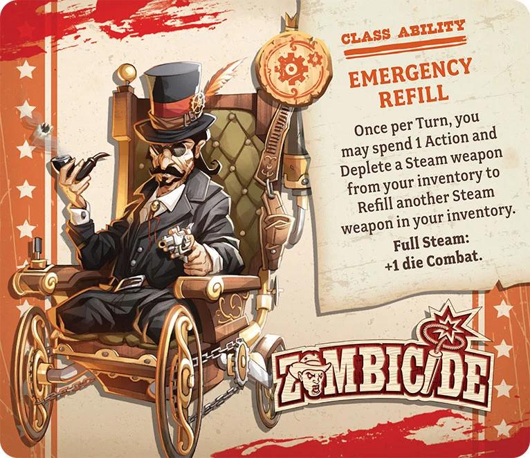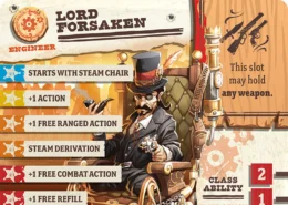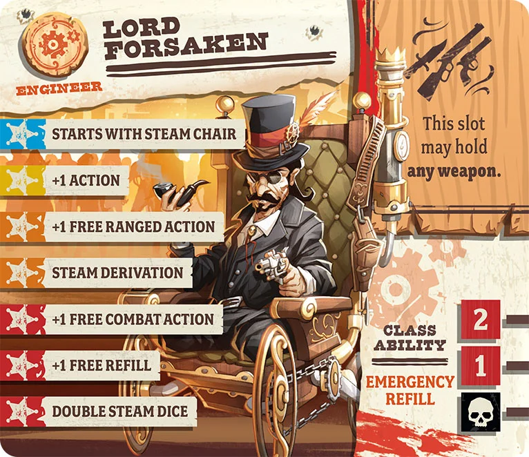 Though ‘Forsaken’ is not his real name, perhaps it gives a clue as to why a British lord would travel so far from his native isles. That said, Lord Forsaken may have had other reasons for such a journey. As a scientist and engineer, his experiments tend towards… well, let’s just say ‘extreme’. His brilliance is obvious, given the elegance of his own self-motive chair which makes up for his lost legs. But a man that looks upon the zombie apocalypse as an opportunity more than a disaster may not be entirely trustworthy.