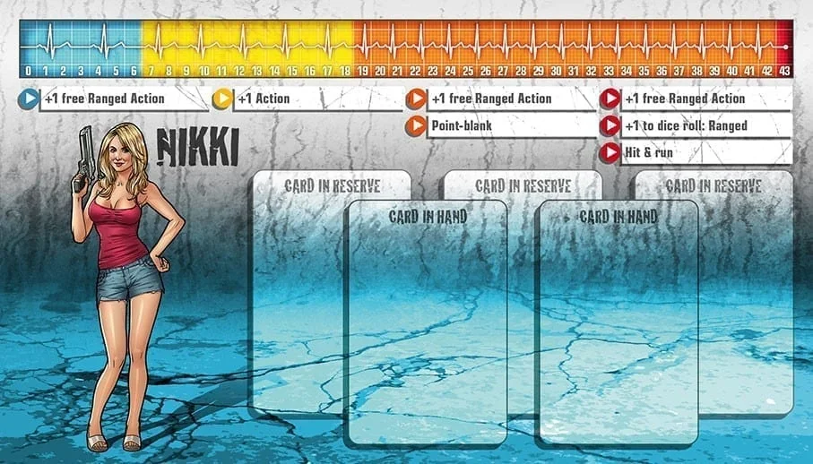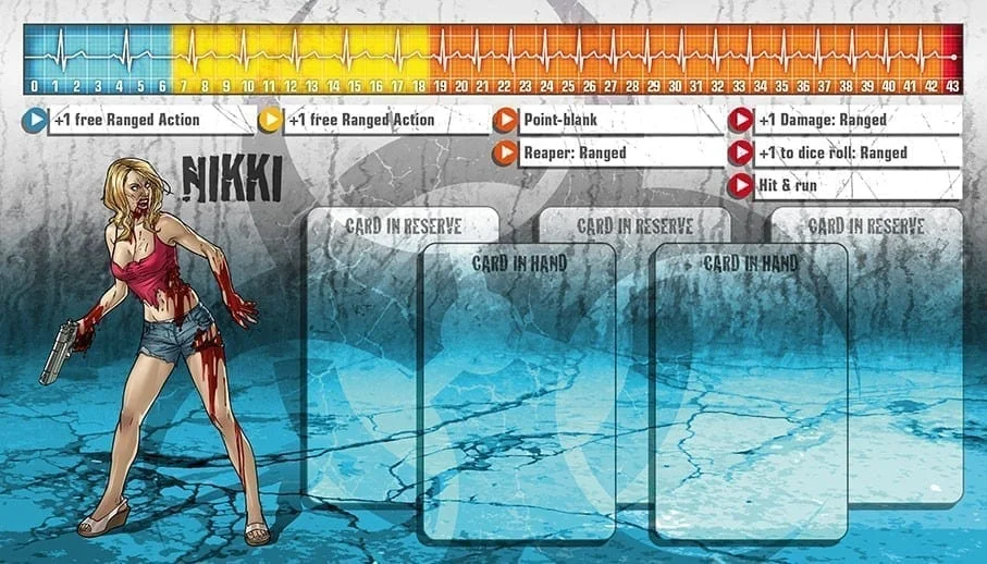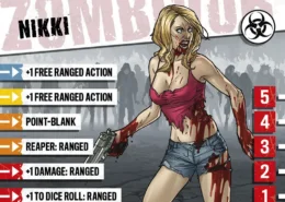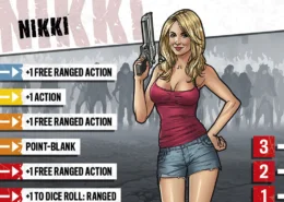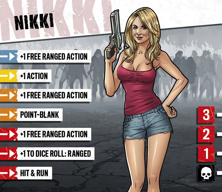 Une fille du Sud, Nikki a grandi en Alabama, dans la ferme d’alligators de ses parents. Ces derniers lui ont appris les ficelles du petit monde de l’alligator, l’écorchage, la vannerie, l’élevage, et bien sûr, la lutte. Nikki prit bientôt les rênes de l’affaire familiale, enchantant des touristes de tous âges en luttant contre des alligators deux fois plus gros qu’elle jusqu’à leur soumission. Quand les zombies vinrent, elle relâcha ses alligators dans la nature, démarra sa moto et fila vers le soleil couchant. Une bénédiction pour n’importe quel groupe de survivants, Nikki est une tireuse hors-pair qui manie un couteau bien aiguisé et qui connaît des centaines de prises de catch.