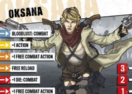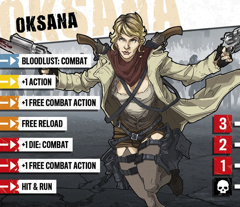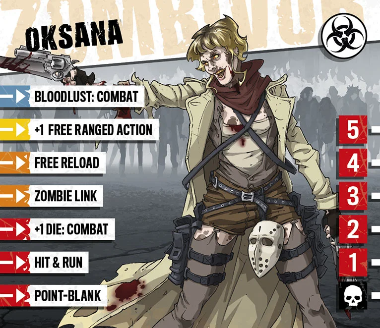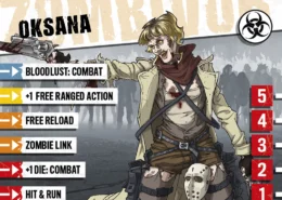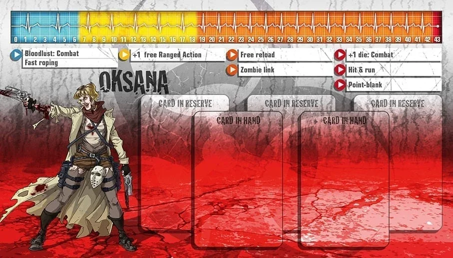 Oksana a entamé très tôt sa carrière de cascadeuse, en sautant sur un trampoline depuis le toit à l’âge de six ans. Sa résolution se raffermit en même temps que son bras cassé. Essuyant du revers de la main les petites blessures qui s’ensuivirent au fil des ans, Oksana trouva sa route jusqu’à Hollywood où ses exploits insensés firent d’elle une star. Aucune cascade n’était trop dangereuse, aucun risque n’était trop grand, aucune altitude trop élevée. Comme tous les accros à l’adrénaline, Oksana savait que sa célébrité valait bien quelque fractures du crâne et des séjours à l’hôpital. L’invasion zombie l’a rendue encore plus téméraire, si cela était encore possible.