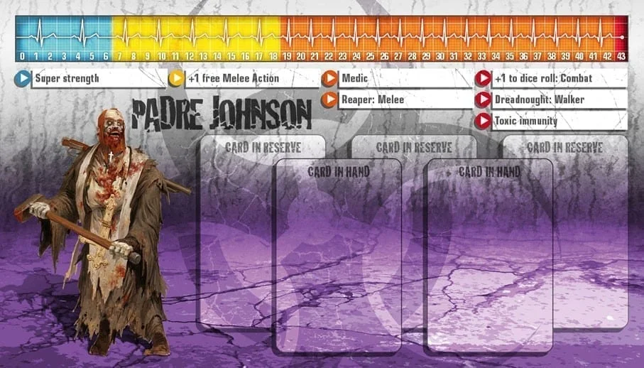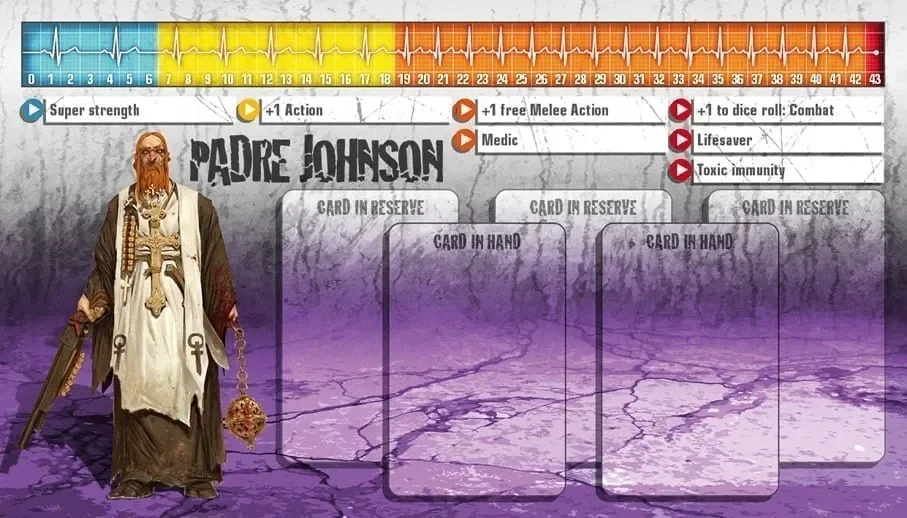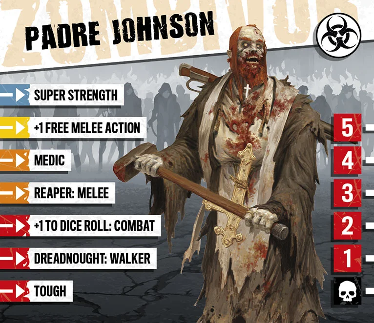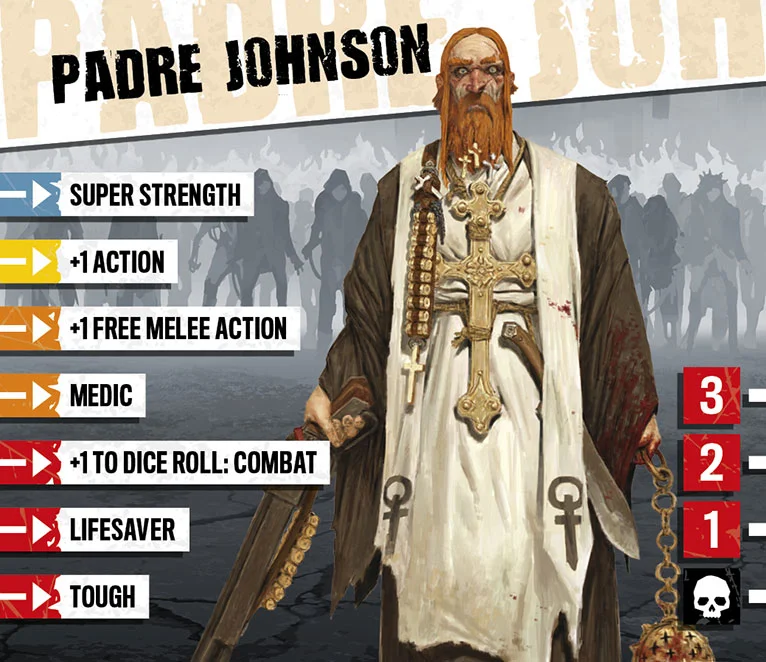 Le Padre Johnson mena son petit troupeau au cours de premiers jours de l’apocalypse, jusqu’à ce qu’ils soient inexorablement encerclés. Le Padre fut l’unique survivant, émergeant miraculeusement des ruines de son église sans égratignure. Il prêche désormais la bonne Parole aux survivants, bien qu’étant un peu secoué d’avoir frôlé la mort. Il est néanmoins à l’aise aussi bien avec un fusil à pompe qu’une rapide prière, et est partout le bienvenu.