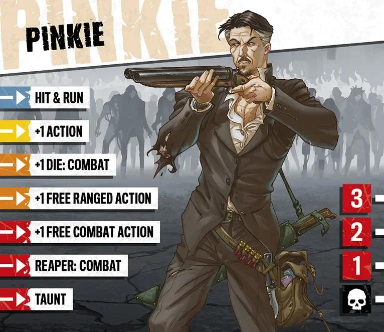 Gill Pink, aka Pinkie, aka The Pinko, aka Big Pink, aka Pinkman, aka… (well, there are dozens) was an important member of the Las Vegas mob, involved in the usual racketeering, prostitution, illegal gambling (which is saying something for Vegas), and any number of villainous side ventures that earned himself plenty of coin over the years. The zombie apocalypse was something he hardly noticed, believing most people to be zombies pretty much day in, day out anyway. But now there’s no more money to be had. He can at least put his old skills to use for a good cause.