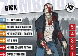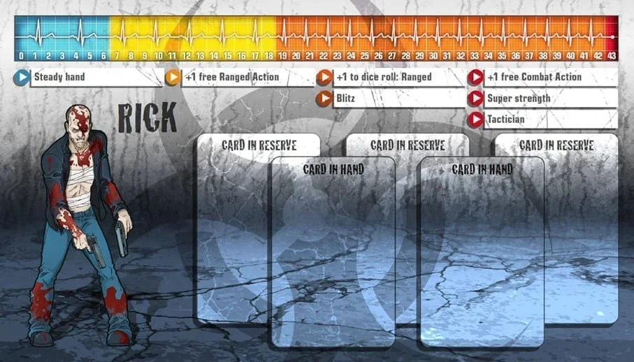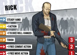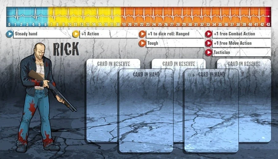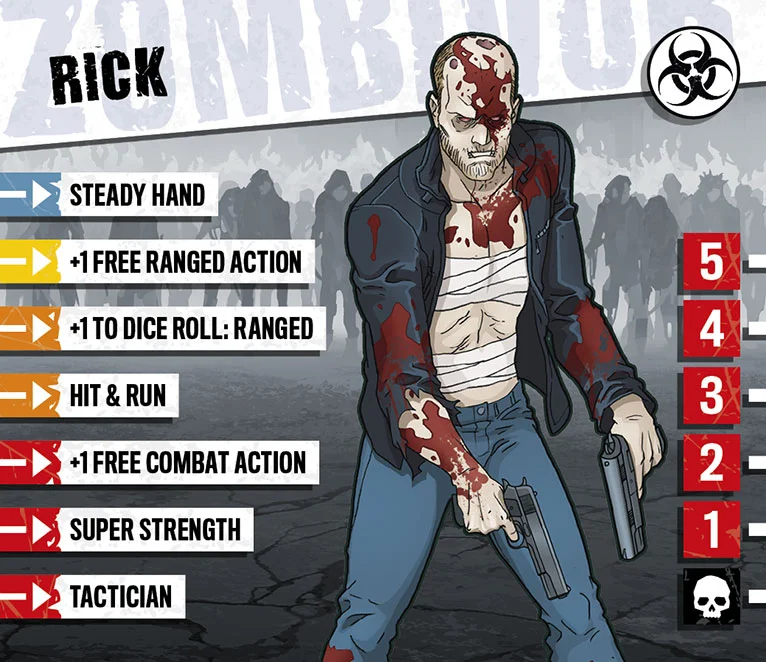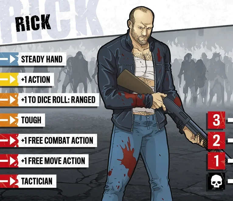 Les gens prennent les cascadeurs pour des trompe-la-mort, des héros méconnus payés pour se mettre en danger et échapper aux pires situations pour permettre à quelqu’un d’autre d’avoir la classe. En vérité, les cascadeurs sont des gens patients et soigneux en parfaite condition physique. Ils planifient leurs cascades comme si leur vie en dépendait, parce que c’est le cas. Rick sait exactement jusqu’où il peut aller et quoi faire quand quelque chose coince. Malheureusement, Rick était à l’hôpital après une cascade brutale quand les zombies sont arrivés et ont emporté la plupart de ses amis. Ses côtes le font toujours souffrir mais cela ne durera pas. Il sera alors temps de se venger. Rick est depuis toujours méfiant à l’égard des autres gens. Ils ploient facilement sous la pression. Il se la joue solitaire pour le moment mais commence lentement à avoir confiance en ses compagnons.
