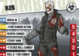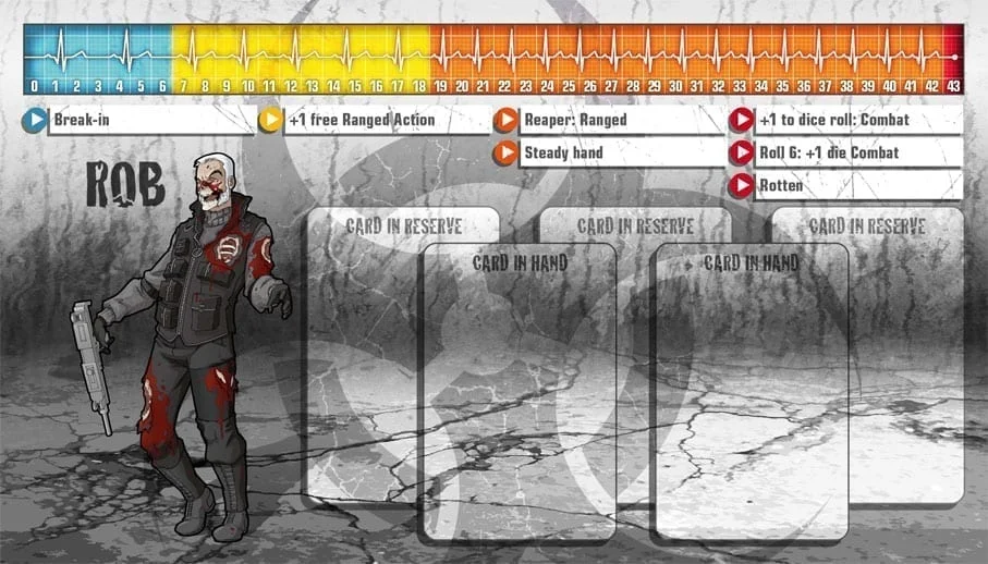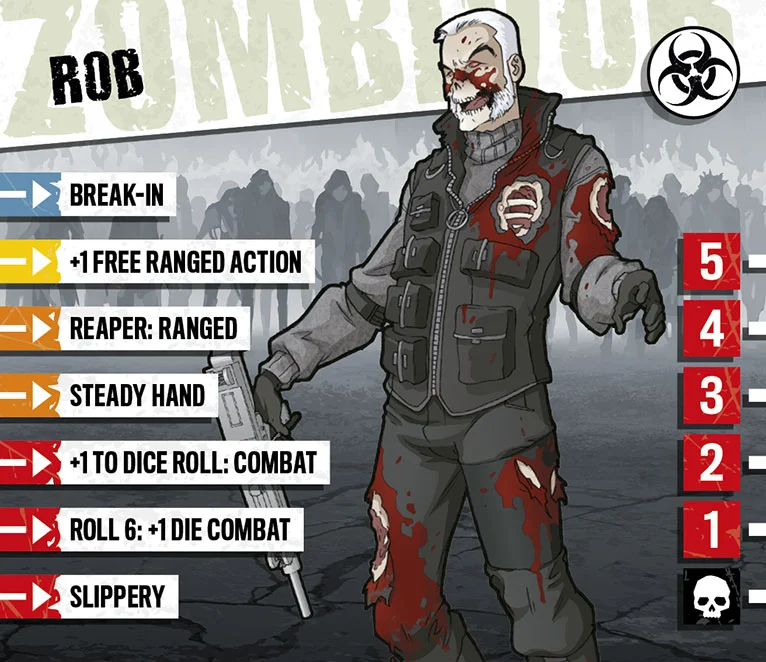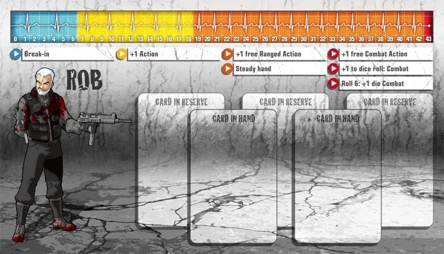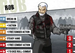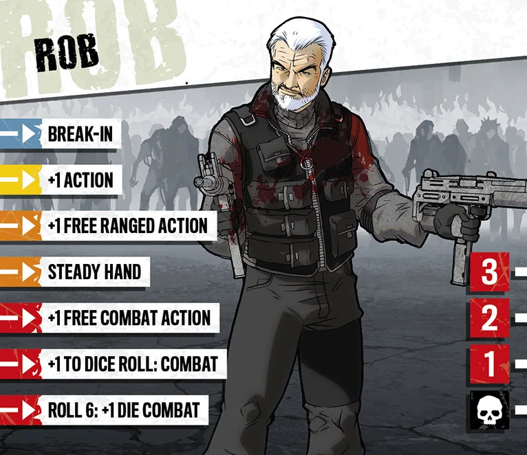 Après des décennies passées en tant qu’expert anti-intrusion, à tester des systèmes de sécurité partout dans le monde, Rob prit sa retraite avec réticence au profit d’une vie idyllique sur une plage ensoleillée. L’ennui commençait tout juste à pointer quand les zombies apparurent, et c’était exactement ce dont il avait besoin pour prendre un nouveau départ. Rob ne se sent pas du tout âgé. Avec une arme à feu dans chaque main, il le prouve n’importe où, n’importe quand.