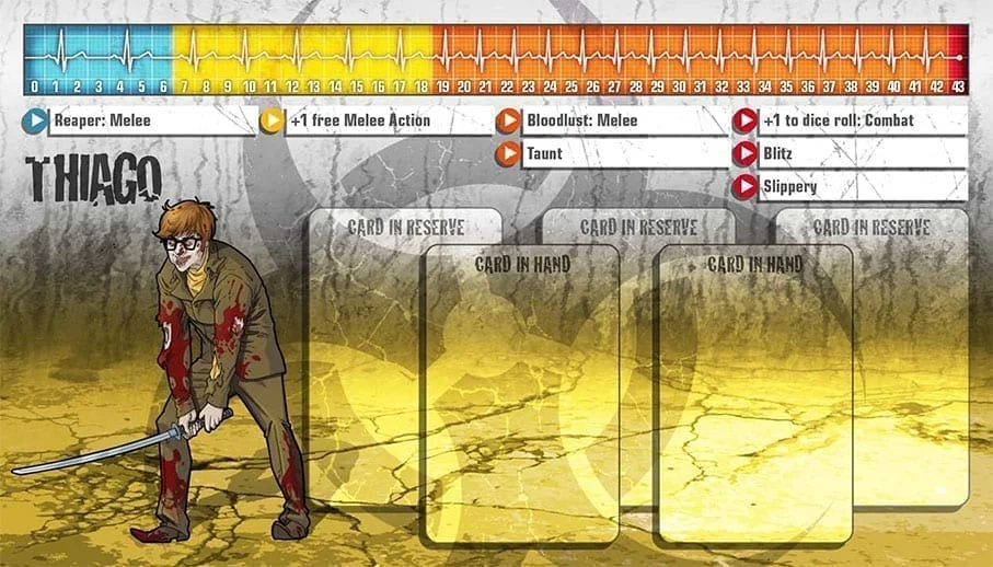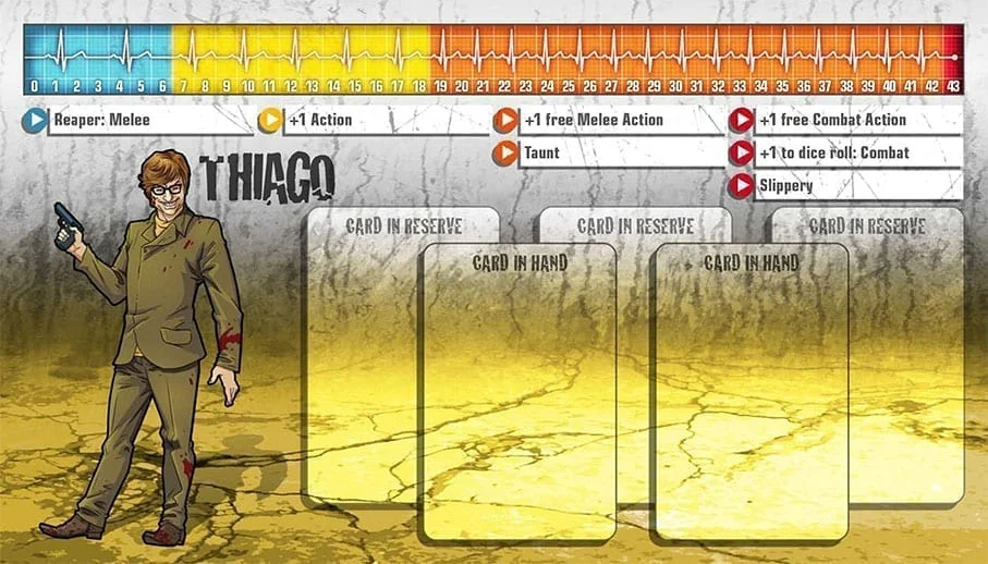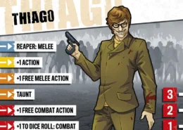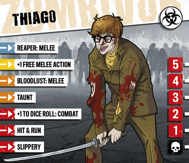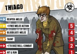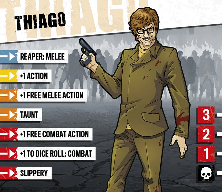 Elevé dans la haute société et issu de la vieille école, Thiago fut soudain livré à lui-même dans un monde hostile quand les zombies vinrent. Ses talents d’escrimeur et de tireur d’élite firent néanmoins mouche, et il rejoint bientôt une équipe de survivants. Thiago s’adapta rapidement au changement de train de vue. Son sens de la chevalerie est néanmoins intact. Le prince apprend le vrai sens de la vie et pourrait revenir du zombicide en tant que roi !