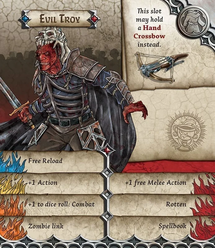 The necromancers have performed many experiments in their quest for the perfect evil, the perfect zombie. One of the worst things they managed was a simulacrum of a living being. This golem remembers everything the original human, Troy, knew; he has all of Troy’s skills. But he is as undead as a zombie, as angry as a raging bull, and as absolutely evil as it is possible to be. Evil Troy is a nasty piece of work, to put it shortly, intent on killing anything – human, zombie, or necromancer – that gets in his way.