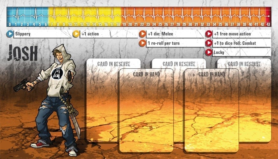 • Josh is the apocalypse’s coolest maverick. He’s the only one who can allow himself to play the free spirit from the beginning of the game thanks to his starting Skill: Slippery. With this Skill he can cross zombie-infested zones without penalty. This allows him to play the bait when his teammates are hidden, to prowl for objectives and, when he has the opportunity, to be a peerless assassin. According to the choices made during his progression, Josh can also become the luckless player’s best friend: his rerolling Skills get him the best results of demanding weapons like the chainsaw, the sub-MG or machete.
