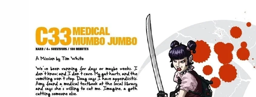 Classic MissionMedical Mumbo JumboTim White Not so long ago, having appendicitis was an easy affair. Now, it’s a nightmare. If you want to save your teammate, you’ll have to go through a medical mumbo jumbo! PDF 1 November 2013 https://cdn.svc.asmodee.net/production-zombicide/uploads/image-converter/2016/01/Mission_C33.webp 1094 845 Thorn https://cdn.svc.asmodee.net/production-zombicide/uploads/2021/11/logo-zombicide-r2.png Thorn2013-11-01 16:52:412018-05-28 09:32:08Medical Mumbo Jumbo