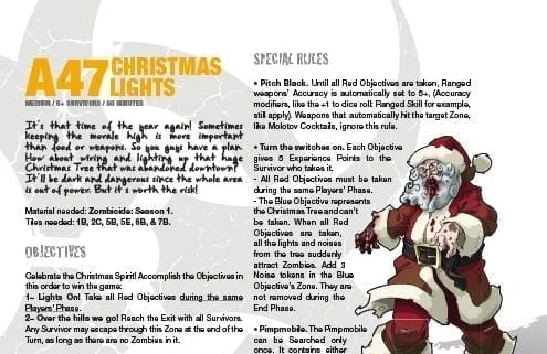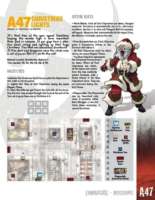 Classic MissionChristmas LightsGuillotine GamesMerry Christmas, survivor! This may be the apocalypse, but we still want to celebrate! We are lighting the abandoned Christmas tree downtown. It will be dark, it will be dangerous, but it will be worth it. PDF 25 December 2020 https://cdn.svc.asmodee.net/production-zombicide/uploads/image-converter/2020/12/Mission_A47_Christmas_Lights.webp 641 495 Thorn https://cdn.svc.asmodee.net/production-zombicide/uploads/2021/11/logo-zombicide-r2.png Thorn2020-12-25 09:00:252020-12-24 17:18:21Christmas Lights