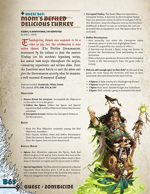 QuestMom’s Defiled Delicious TurkeyK.L.CruzThanksgiving turns grim as a Necromancer, unable to find the perfect turkey, spreads dark magic corrupting ingredients. Survivors must save the spices and feed him a corrupted turkey! PDF 29 November 2025 https://cdn.svc.asmodee.net/production-zombicide/uploads/image-converter/2025/11/B63-Moms-Defiled-Delicious-Turkey.webp 641 495 Isadora Leite https://cdn.svc.asmodee.net/production-zombicide/uploads/2021/11/logo-zombicide-r2.png Isadora Leite2025-11-29 00:49:292025-11-29 00:49:29Mom’s Defiled Delicious Turkey
