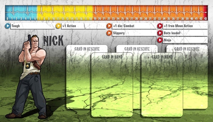 • Nick is ideally equipped with a ranged weapon in one hand and a melee weapon in the other. The Orange level Skill choice is crucial here. Slippery, he’ll go for a chainsaw and a Sub-MG. With an additional die in Combat, he’ll favor a rifle (or better, a sniper rifle) with an axe.