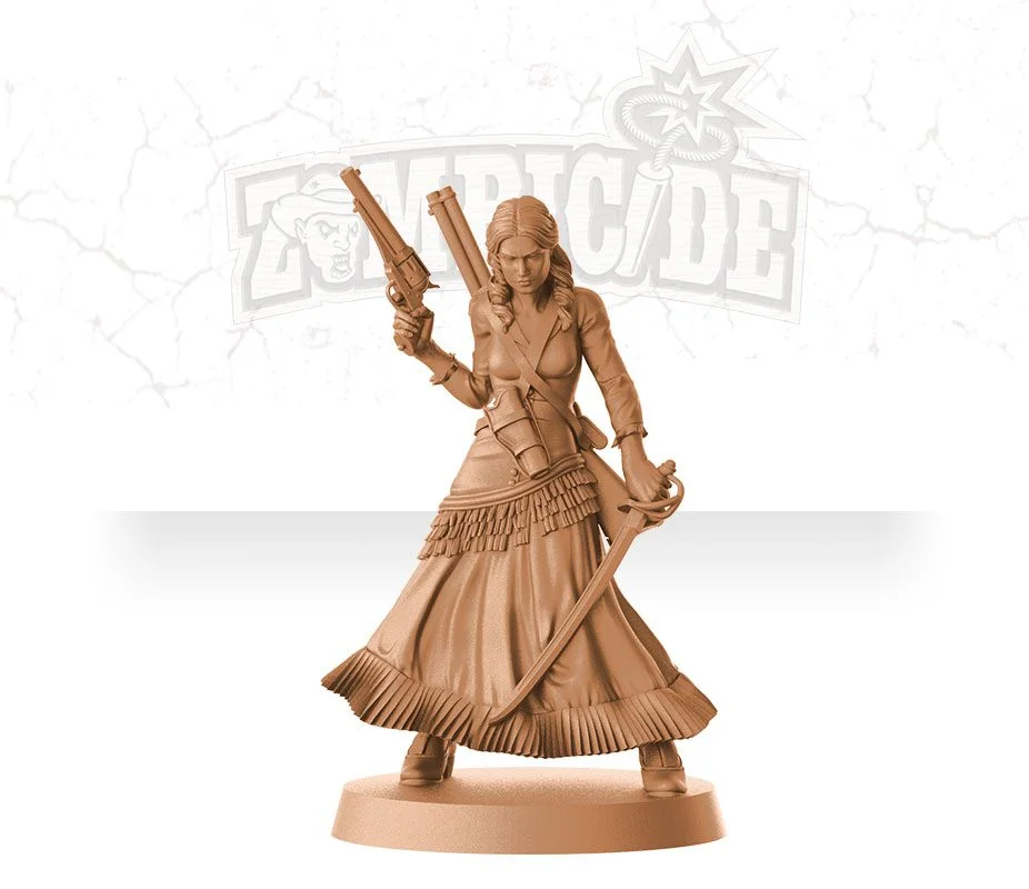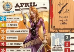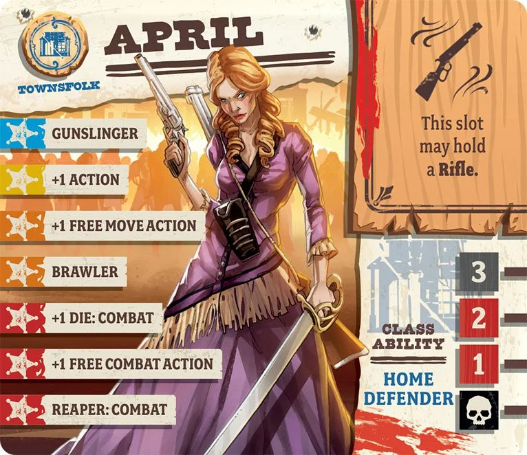 As the widow of an undertaker, April has seen more than her share of death since moving out West. She’d often work as his assistant, tending to the corpses, some of them not so pretty. Thus, she’s unfazed by the shambling hordes, or at least by their appearance and the wide variety of odors such horrors breed. Her husband was among the first taken by surprise when their latest ‘client’ rose to attack him. April put down the client, then her husband shortly thereafter. She’s a hard woman, made all the harder by the apocalypse.