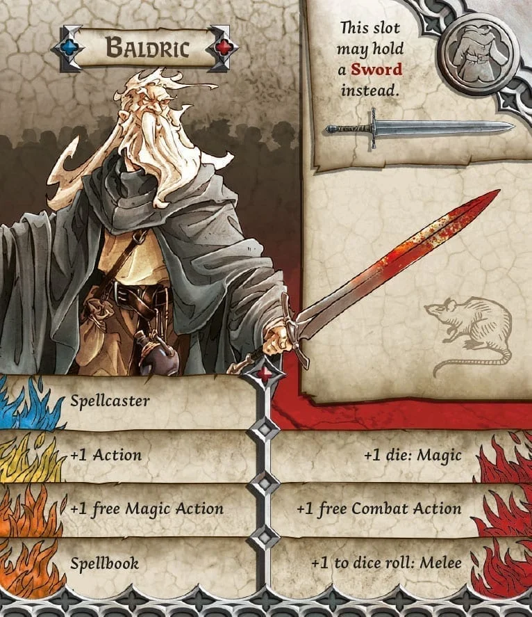 Baldric was a brilliant adventurer. Mighty, mysterious, and powerful, his magical might became legendary. Yet he always valued his research skills over his magical prowess. Knowing what spell to use against the right kind of opponent gave him the edge that let him live to a ripe old age. His magic academy continued to preach this doctrine, despite heavy criticism from his magical peers that wanted arcane knowledge to remain ‘occult’ and hidden. All that changed with the horde’s invasion. Now he travels where needed, teach anyone that wants to learn, and blasting any zombie that dares show its face.