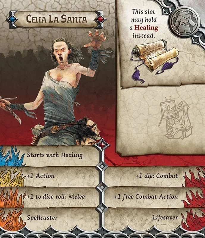 Celia La Santa (Saint Celia to those who don’t speak her native tongue) was once a healer and herbalist, cast into the fighting pits for failing to cure a nobleman’s impotence. She was not expected to survive long, but two weeks of thundering storms left the pits closed to exhibitions. During that time, she was housed with her fellow fighters, where her natural healing talents came to light. In exchange for her healing arts, many of the grateful pit brawlers taught her the basics of survival in the pits. As it so happened, the gentle herbalist was a fast learner. Her swordsmanship isn’t the best, but her spellcraft gives her an edge that so many others lack.