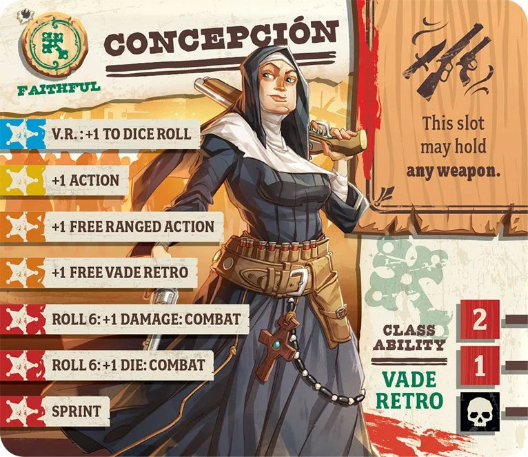 Sister Concepción’s past is a bit murky, but the way she handles firearms speaks volumes about interesting days before she joined the convent. She traveled to the American West with her mission to spread her religion to the masses, and do some good for people and communities in need. No one ever expected that such ‘good’ would take the form of laying down covering fire with a 12-gauge, but the Lord works in mysterious ways, and Sister Conception goes where she’s most needed. Some times that’s the soup kitchen. Sometimes it’s to a flanking position with extra ammo.