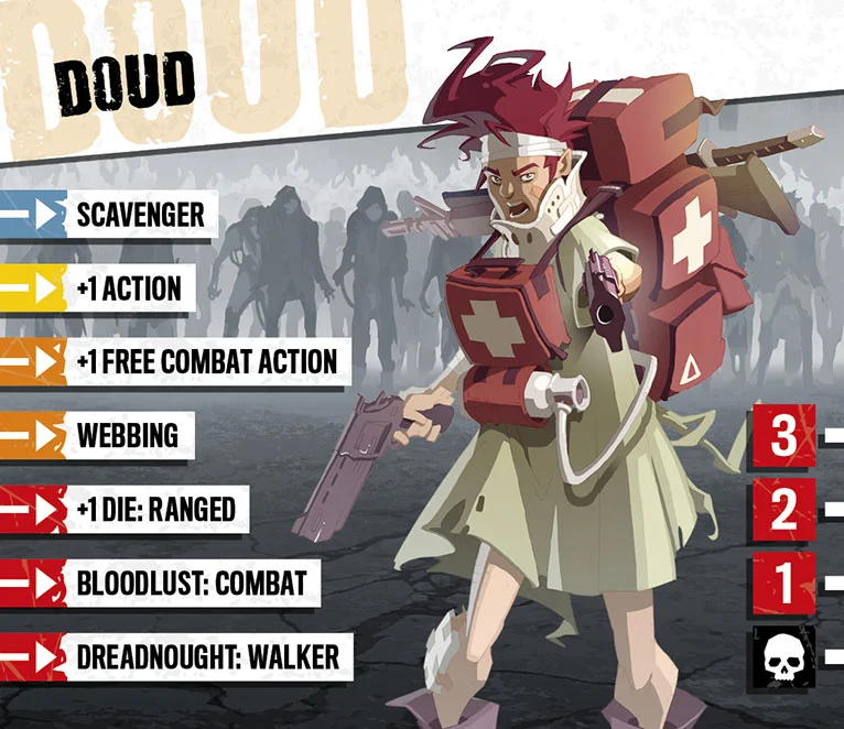Doud had a spectacular skateboard accident mere hours before the zombie invasion. He awoke in the turmoil, as infected people were turning into zombies and began to attack anyone in sight. His will to live, however, was stronger than the zombie tide. Doud took anything he could find and turned it into a weapon, until he found his first real weapons. He was the one to Molotov the Hospital Central and turn it into a funeral pyre. Despite his awesome feat, Doud still has to be taken care of. Finding medical supplies in a devastated town isn’t easy. Hopefully, his new buddies will help him heal and once he’s in the green again… Payback time.