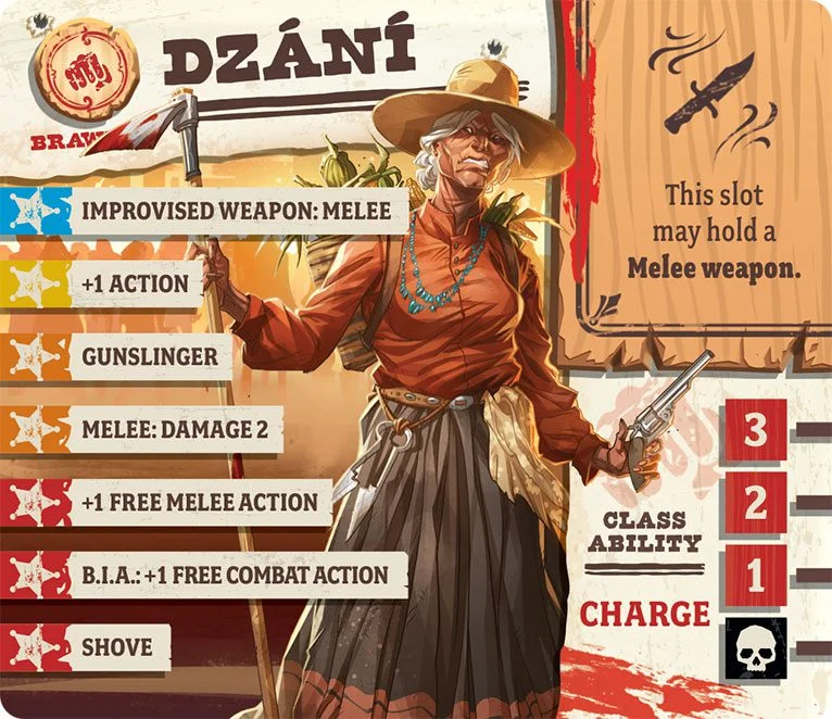 Dzaní is not used to fighting but can hold her own when necessary, like most Navajo. More advantageous is her eye for useful materials and her talent for growing crops. Not much call for sowing a field in a pitched battle, but spotting a weapon tucked here or some bandages there has saved her life and others more than once. When everything is over, she’ll help whoever remains re-sow their fields and begin anew.