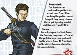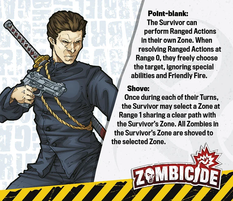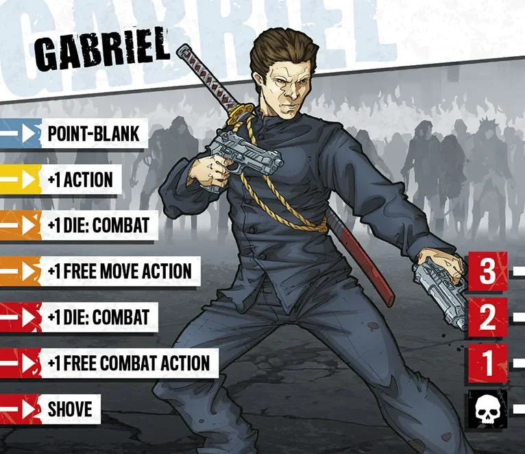 A man of action, Gabriel grew from a rank-and-file policeman to a respected anti-drug cop. Fighting zombies well before the real zombies came, he designed a very efficient intervention method to deal with drug-laced thugs in close-quarters. A zombie tide destroyed the society he was fighting for and soon made him a legend among survivors: a wise gunslinger willing to help anyone meeting him with a good cause to fight for.