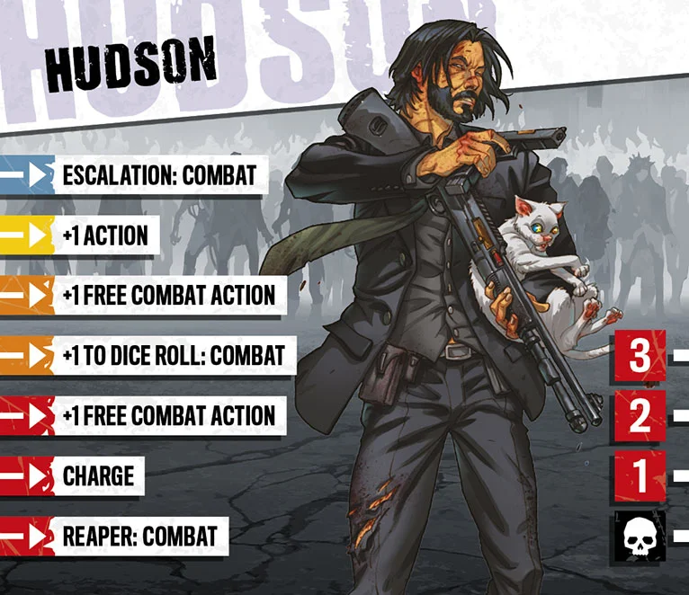 Hudson has won gold medals in the last three Summer Olympic Games for marksmanship. His skills are so remarkable as to be dubbed supernatural by professional shootists around the world. Hudson had never fired a weapon at a living thing until the zombie apocalypse (and still may not have, if you don’t count zombies as living). But the experience cracked his psyche like an egg. He rescued a tiny kitten from the clutches of an abomination singlehandedly, and has since latched on to Bae as his lifeline to sanity in this insane world.