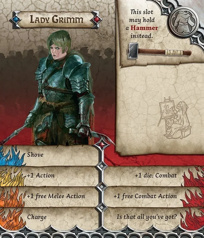 They call her Lady Grimm, the other knights, the peasants, her lord. Nobody has asked her what her name is, but neither has she volunteered it. She volunteers almost nothing, says almost nothing. Since the day she showed up at the fort, half-drowned and wearing a ruined arming jacket, her eye and face marred by a livid cut, she has been mysterious and quiet. But she has also been fierce, the strongest defender of the fort, the first into any fray. Zombies stop moving when she hits them with her war hammer, and don’t get up again.