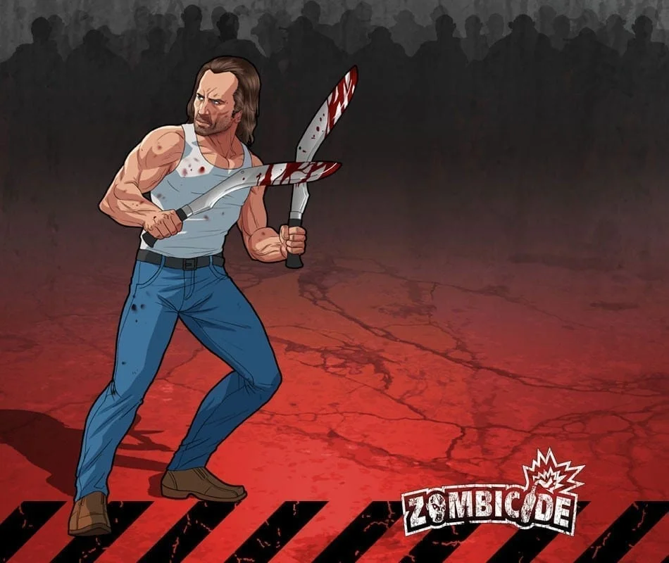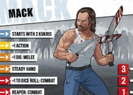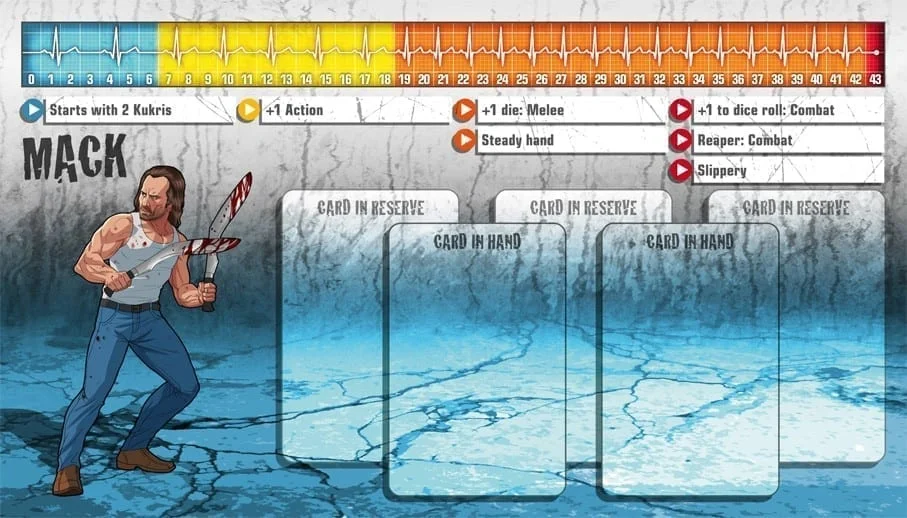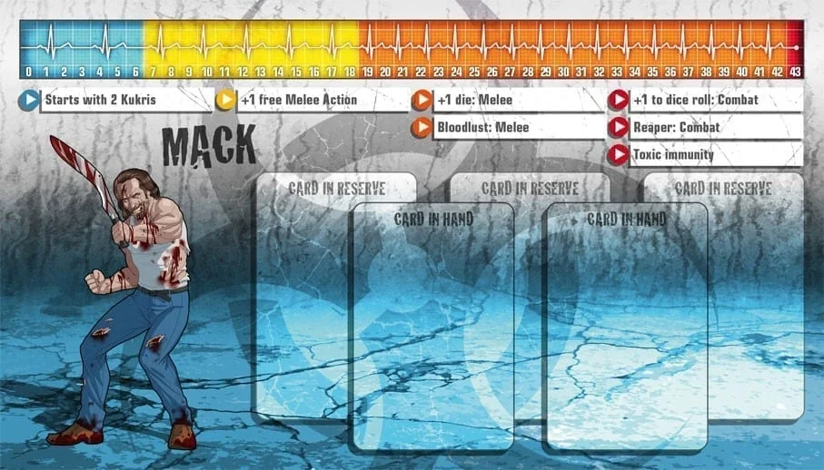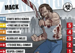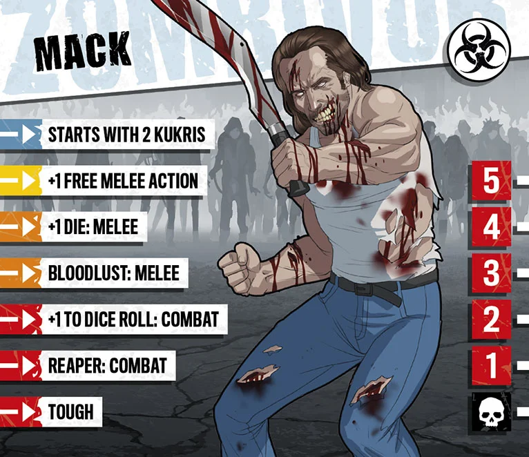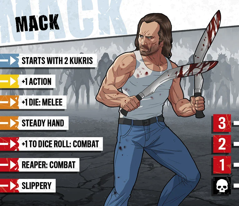 Mack’s story is like most – an ordinary, happy man until the zombies rose, forced to dig deep or die. His peaceful previous life hid his true potential – unfortunately, it took burying his wife and two daughters to bring it out. Taking a car from his lot, he began a cross country zombicide, eventually joining the motley crew of survivors. Mack’s fighting spirit has made him a precious resource for any team, and his manic grin gets even wider the worse the odds are!