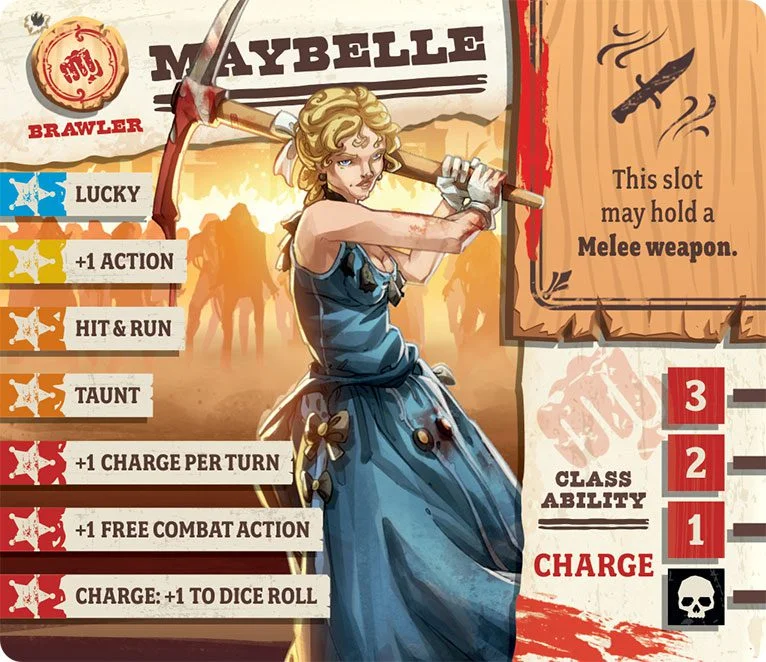 Maybelle generally made her living in the West by attaching herself to the wealthiest arm she could find. Of course, those arms didn’t remain wealthy for long. It was a profitable life, if somewhat migratory. A true Southern lady, she beguiled all those around her with charm and wit, always ready with a smile and a jest. Such things are much needed now that days are dark and the dead walk the Earth. There’s not a lot of money to be made out West anymore, but Maybelle will be happy to simply survive.