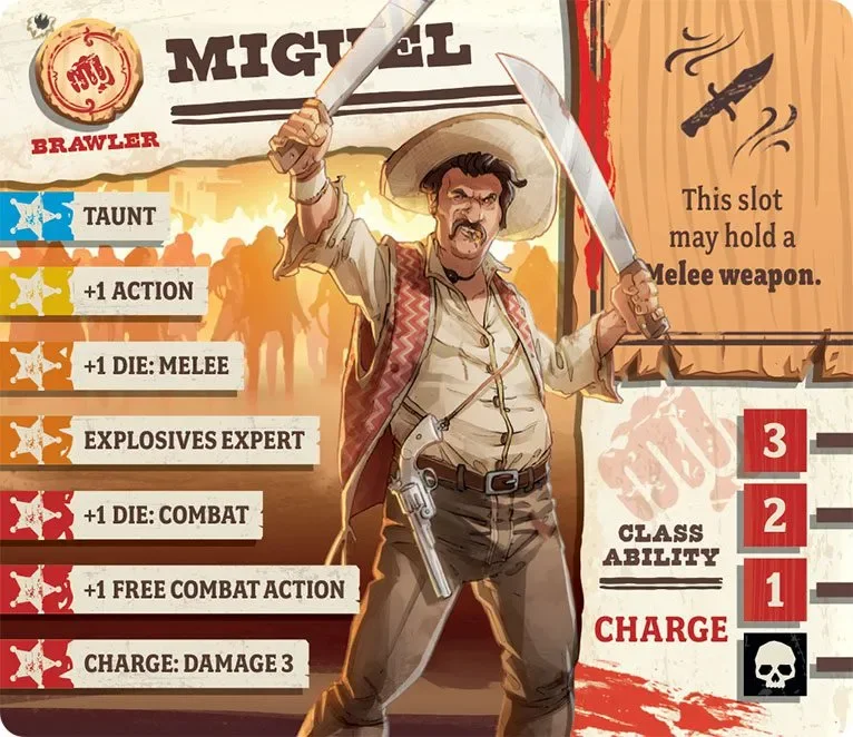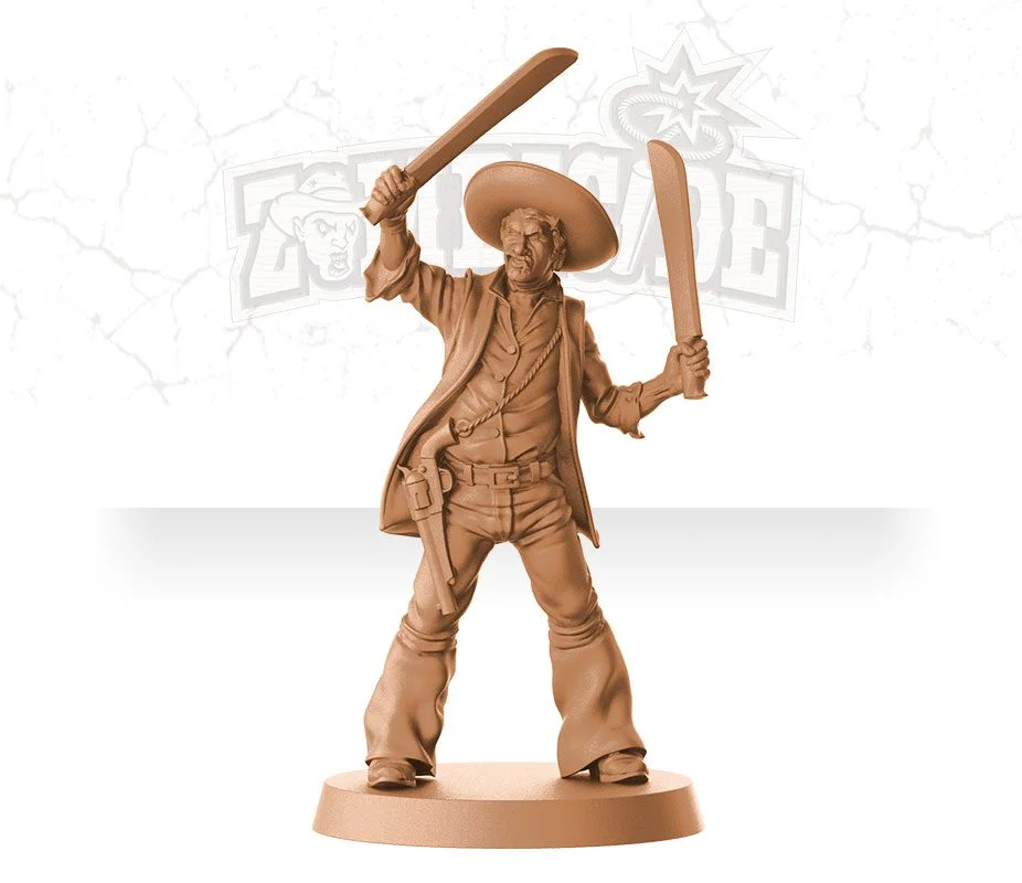 ‘Machete’ Miguel got his start in the West by clearing scrub country for ranching land. Being paid by the acre, he became one of the fastest workers out there, eventually earning more than enough money to buy a small herd and some territory of his own. In just a few years, Machete was raking in the cash, and his beef was known from Chicago to Kansas City as some of the best in the West. And then the zombies came, and right at the worst time. But, Miguel holds out hope that they’ll all hack their way through to a better life.
